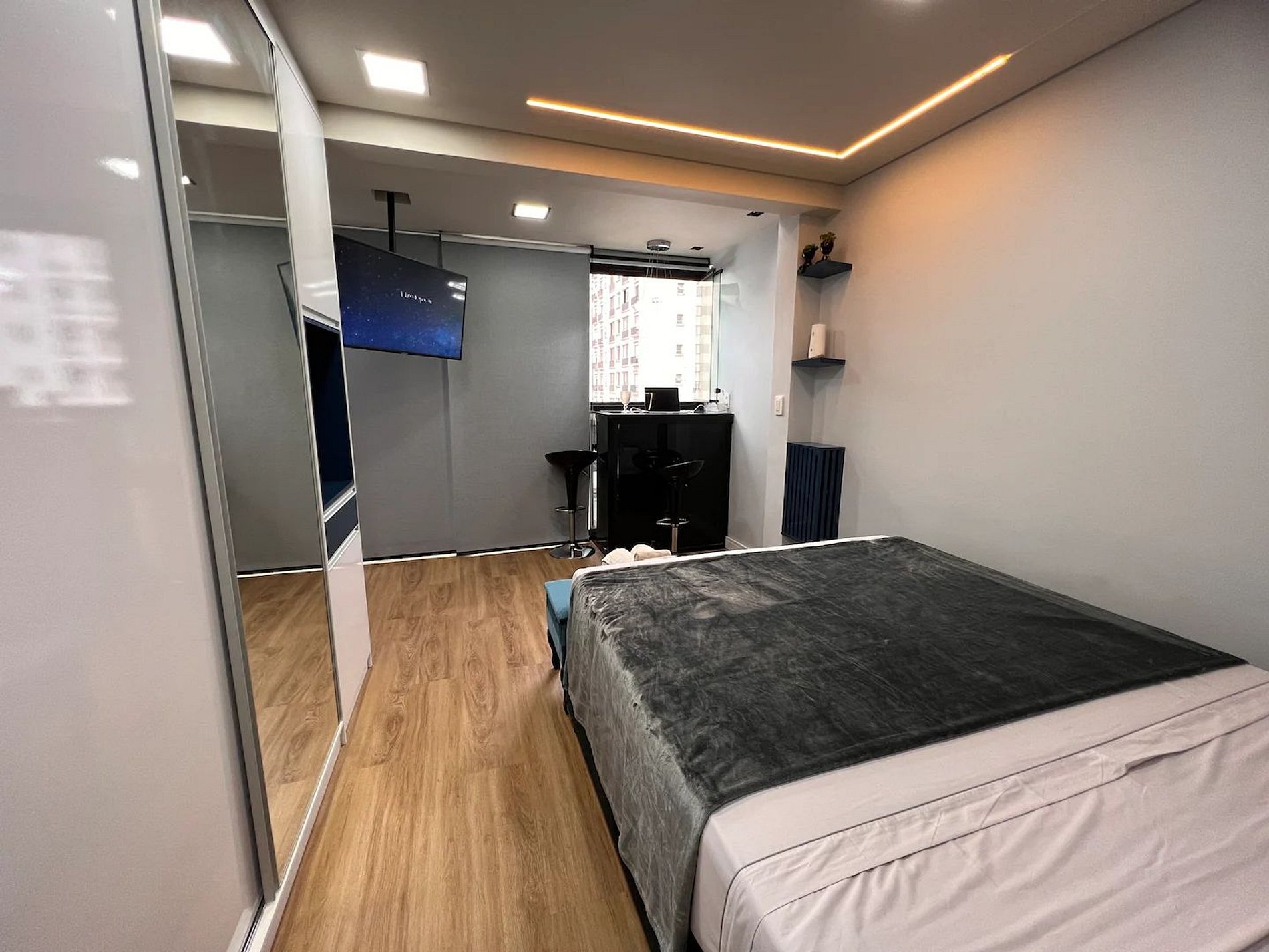 Nosso studio de 24m2 possui uma atmosfera urbana totalmente integrada a vibe da cidade, perfeito para quem procura uma estadia confortável e repleta de comodidades para proporcionar uma experiência inesquecível.