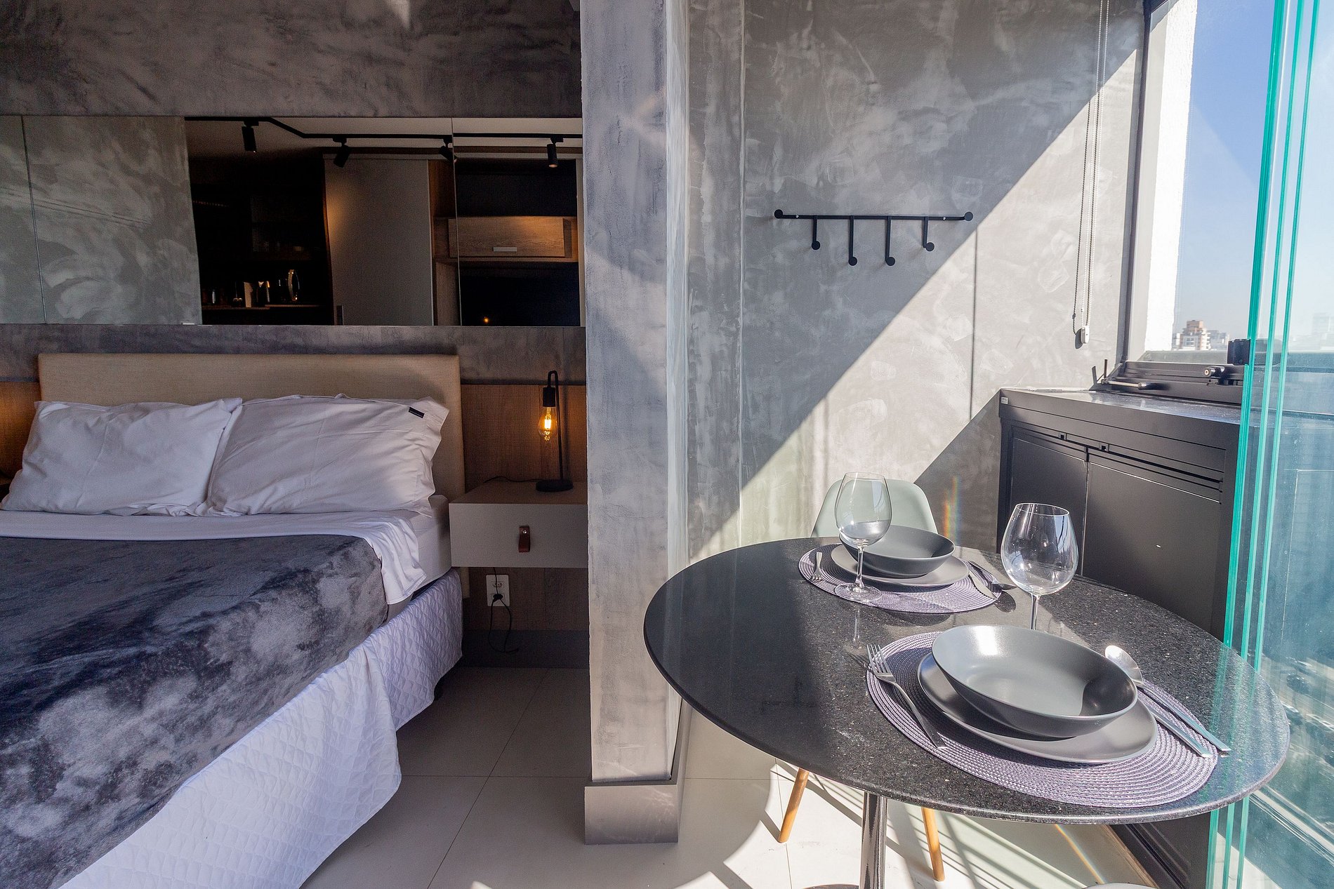 Recém construído, nosso studio de 24m2 possui uma atmosfera urbana com decoração moderna, repleto de comodidades para atender hospedagens de curta ou longa temporada.