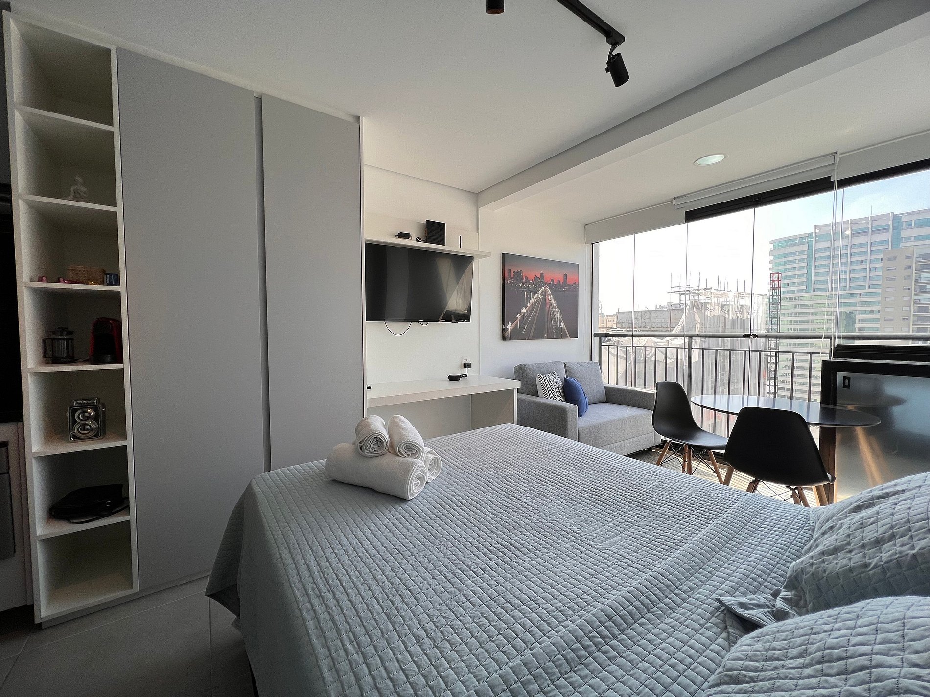 Studio novíssimo de 24m2 com design moderno e funcional, projetado para oferecer total conforto e comodidade ao hóspede, pensado desde o enxoval no padrão de hotel, até recursos de inteligência artificial disponibilizando a Alexa Echot Dot como concierge pessoal da sua hospedagem.