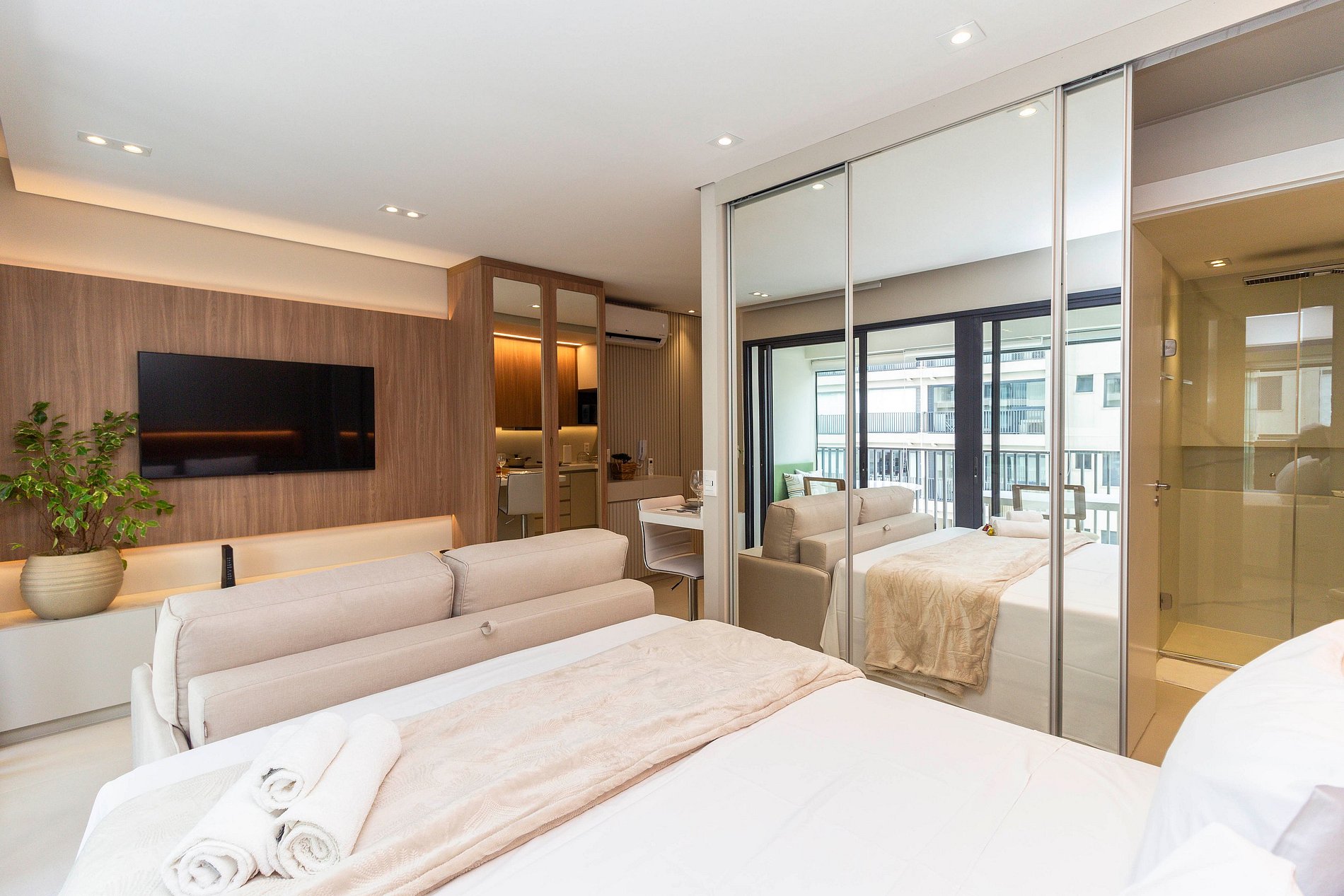 Recém construído, nosso amplo studio de 40m² possui uma atmosfera moderna com decoração sofisticada, super equipado para atender nossos hóspedes que não abrem mão de conforto e sofisticação em suas estadias.