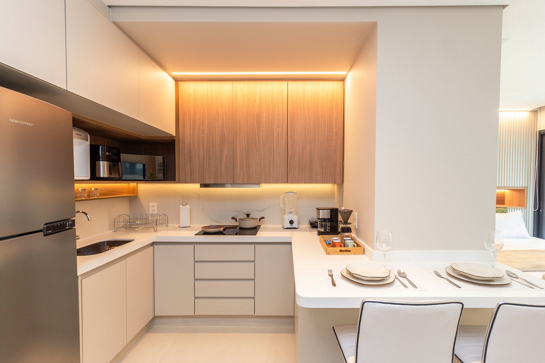 Este studio está repleto de comodidades atendendo hospedagens de curta ou longa temporada.