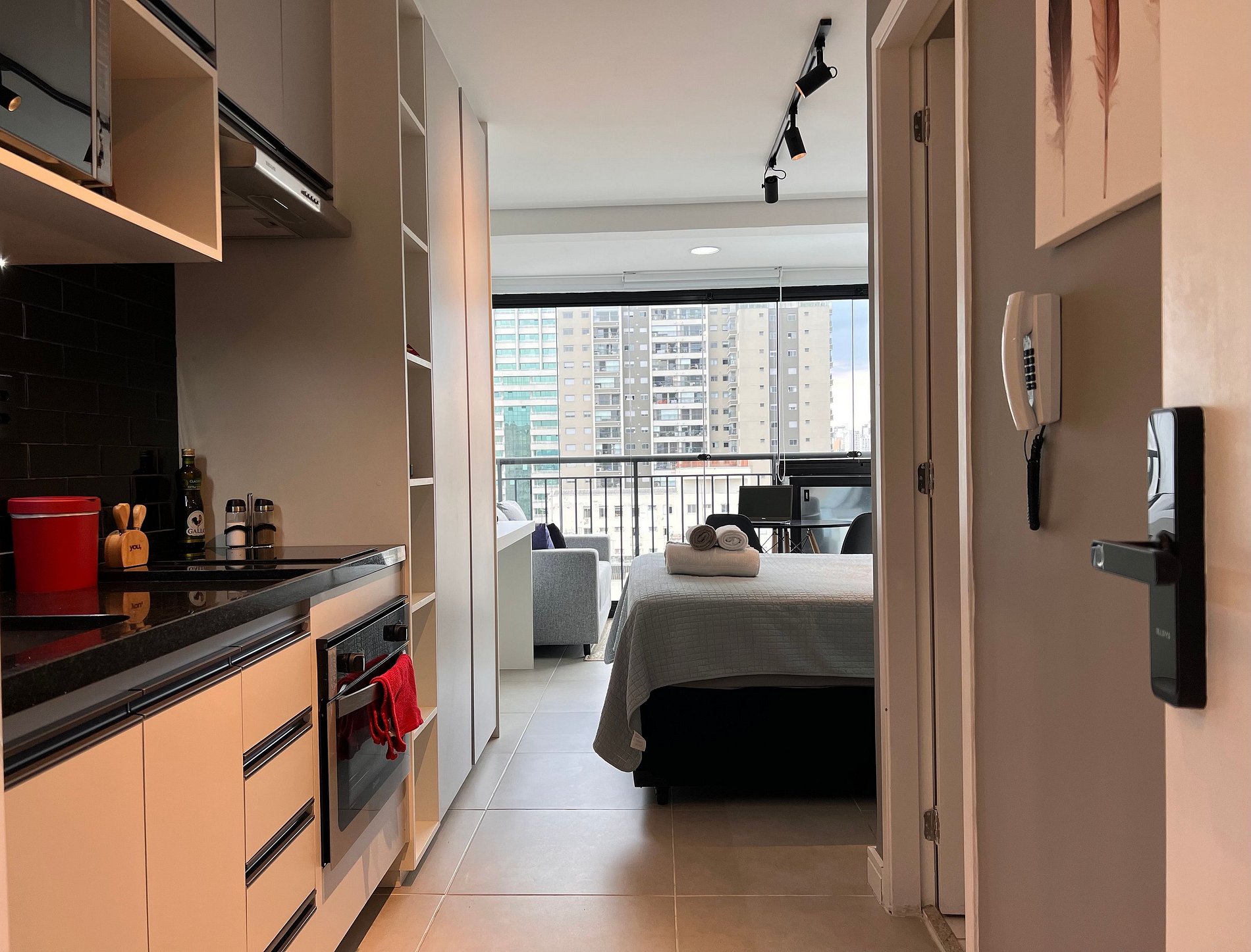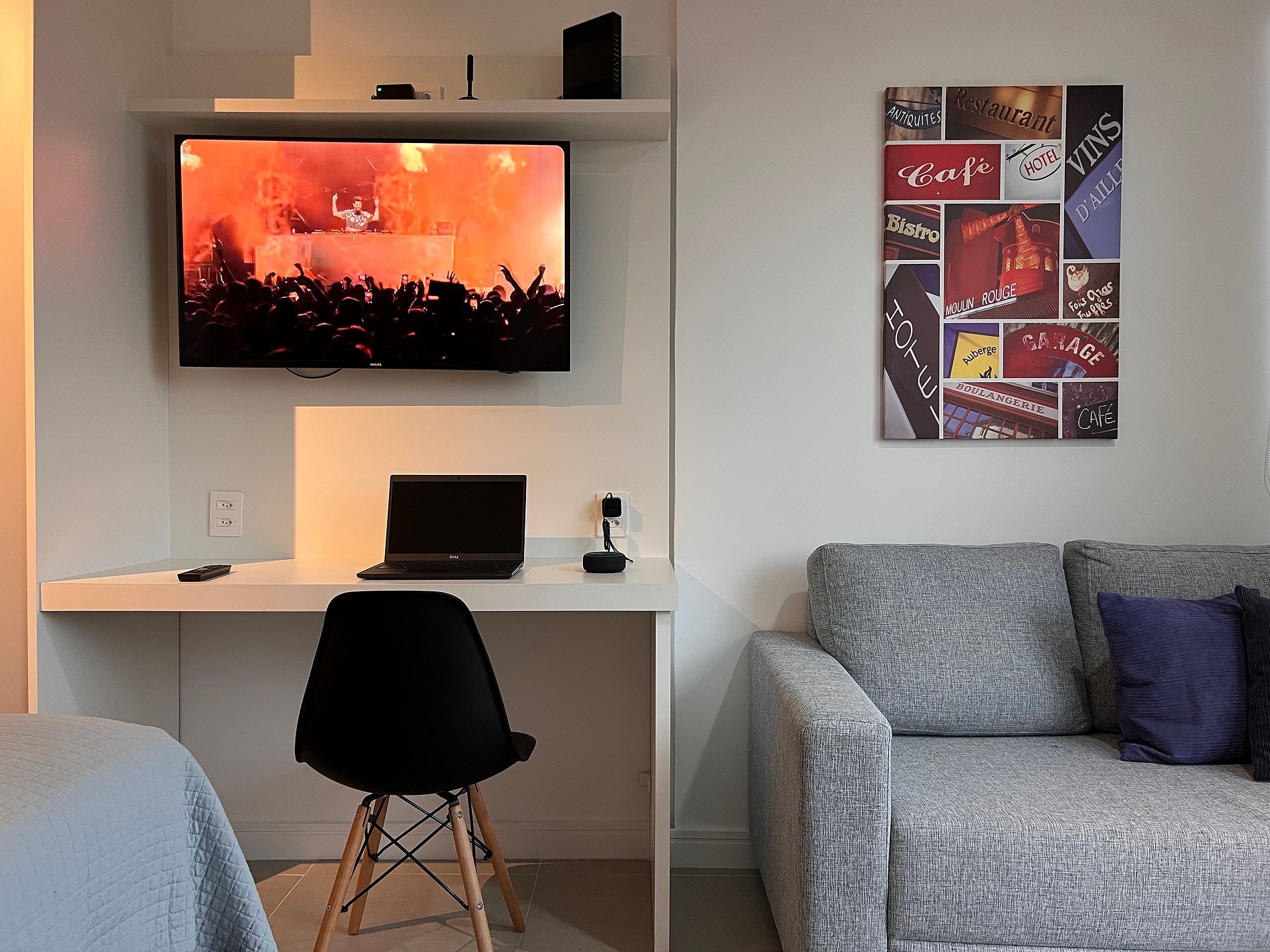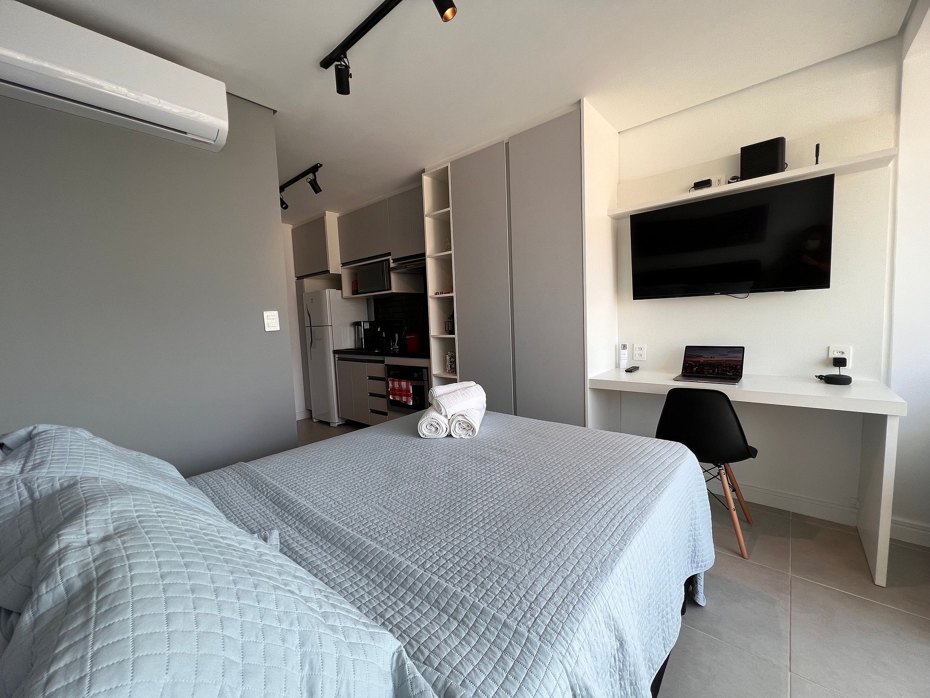 Nosso studio compacto de 24m2 é super funcional, aproveitando cada espaço para oferecer uma experiência completa na sua estadia, seja para hospedagens de curta ou longa temporada.
