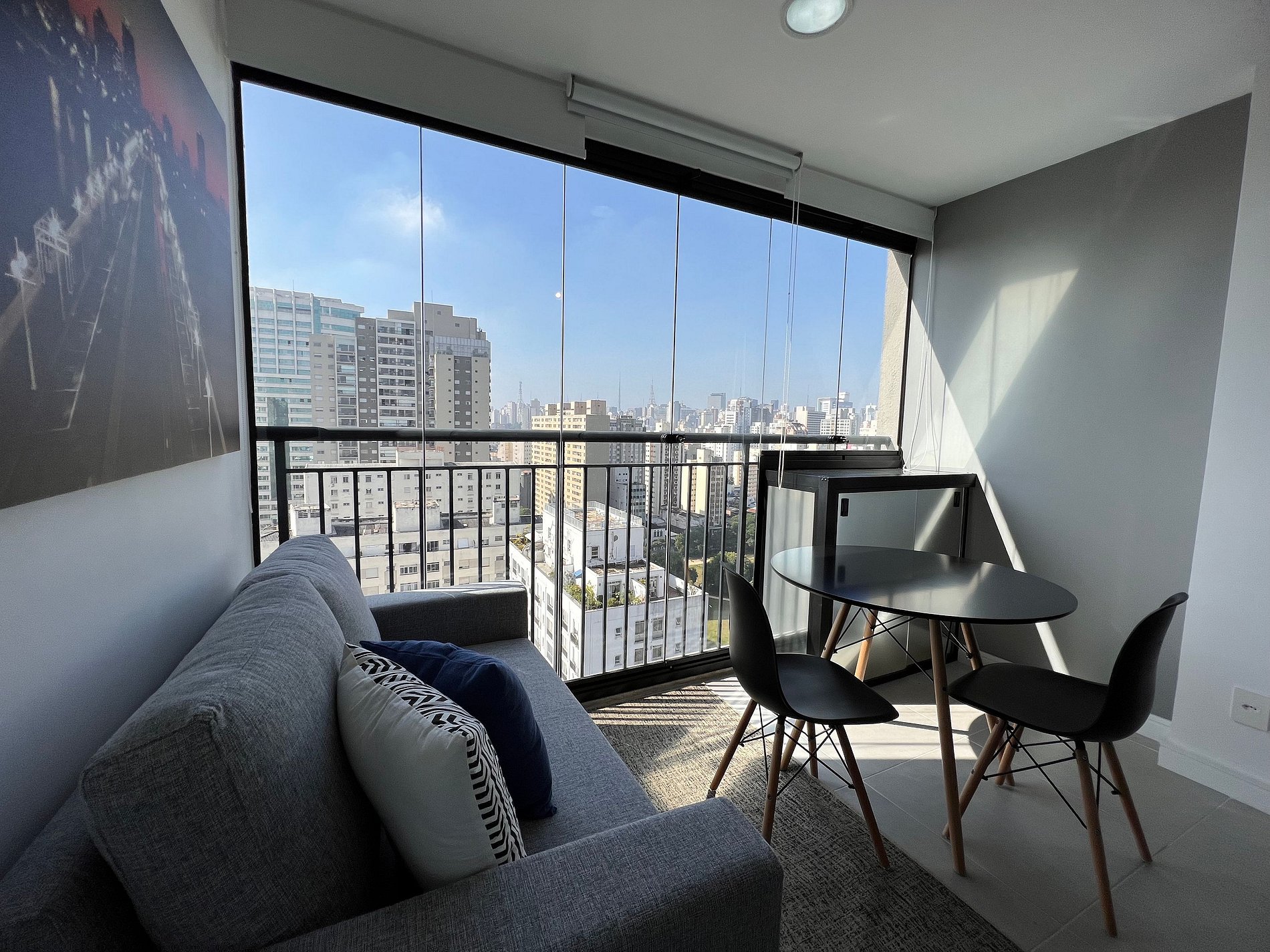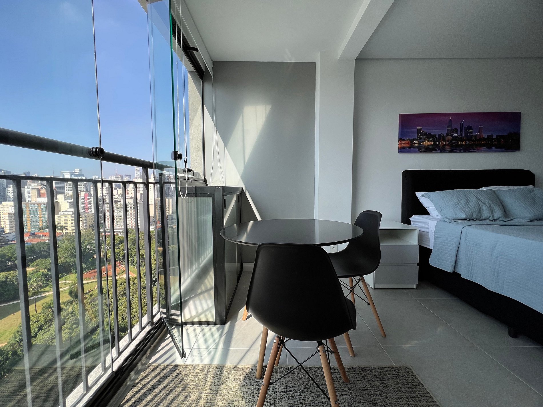 - Sala de estar com sofá e varanda com vista para o Parque Augusta