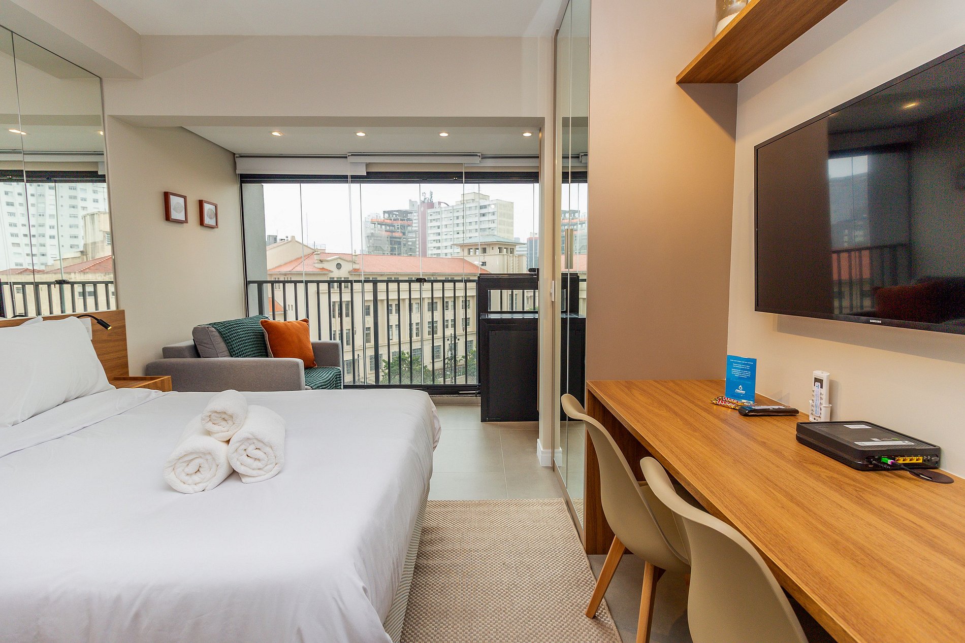 Este studio está repleto de comodidades atendendo hospedagens de curta ou longa temporada.