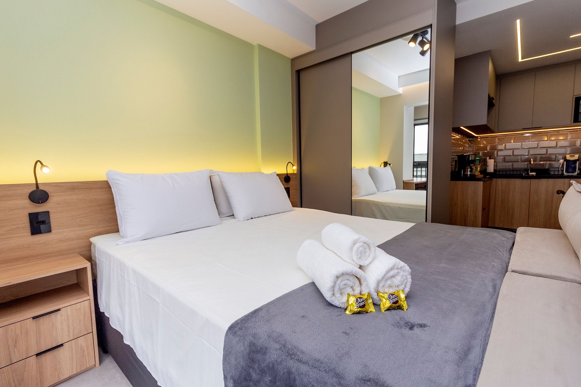 Amplo apartamento de 40m² possui uma atmosfera moderna com decoração sofisticada, super equipado para atender nossos hóspedes que não abrem mão de conforto e sofisticação em suas estadias, estando pronto para acomodar até 4 pessoas** confortavelmente.