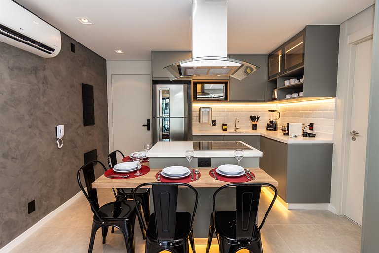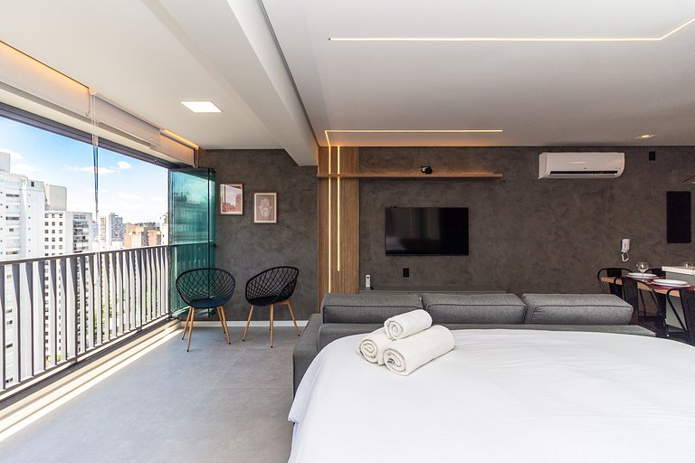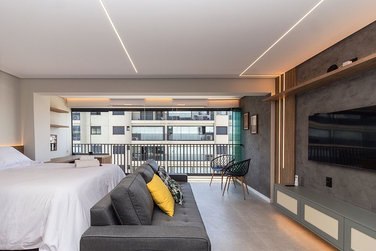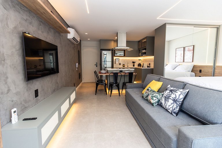 Recém construído, nosso amplo studio de 40m² possui uma atmosfera moderna com decoração sofisticada, super equipado para atender nossos hóspedes que não abrem mão de conforto e sofisticação em suas estadias.