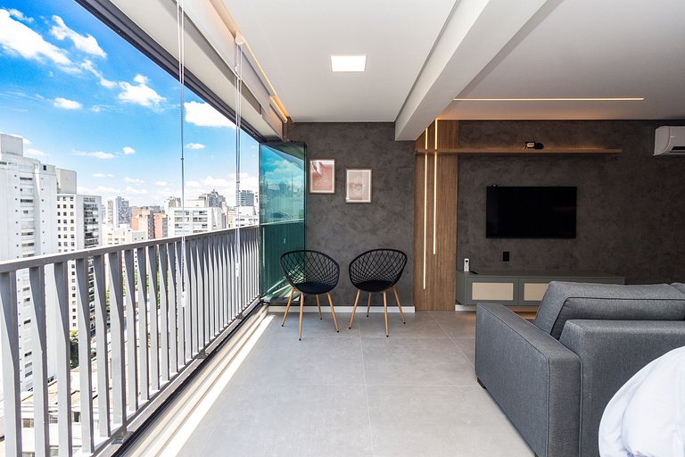 Sofisticado studio de 40m² em andar alto e varanda gourmet, localizado no eixo Centro-Paulista, bem ao lado do Shopping Frei Caneca, a poucos passos de hospitais de referência como Sírio Libanês e Nove de Julho, 15min a pé da Av. Paulista e 10min do metrô Higienopólis-Mackenzie, se hospedar por aqui significa ter tudo a sua volta.