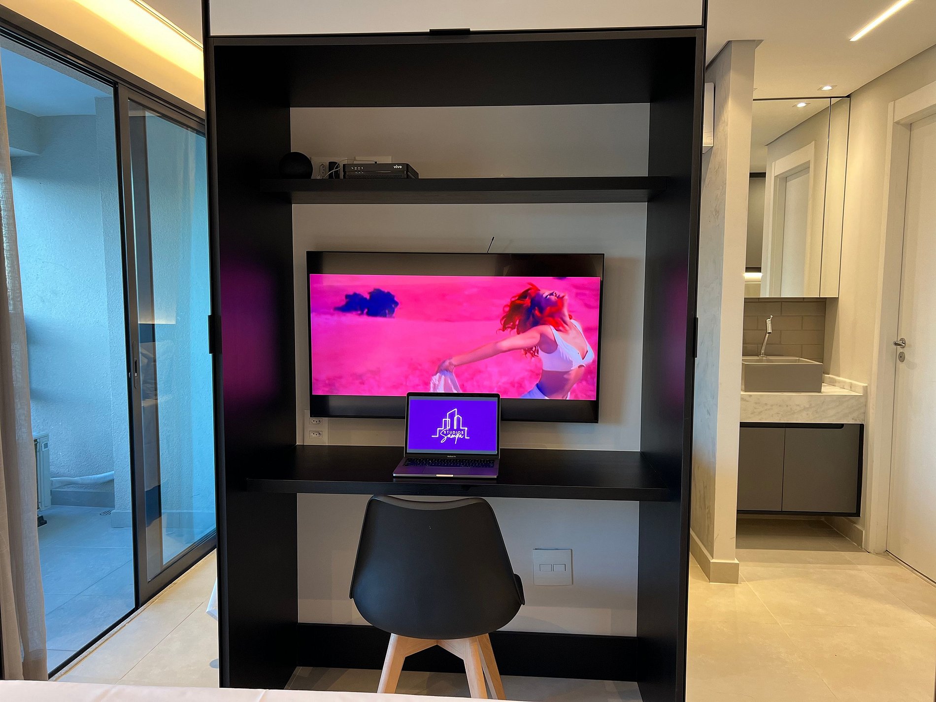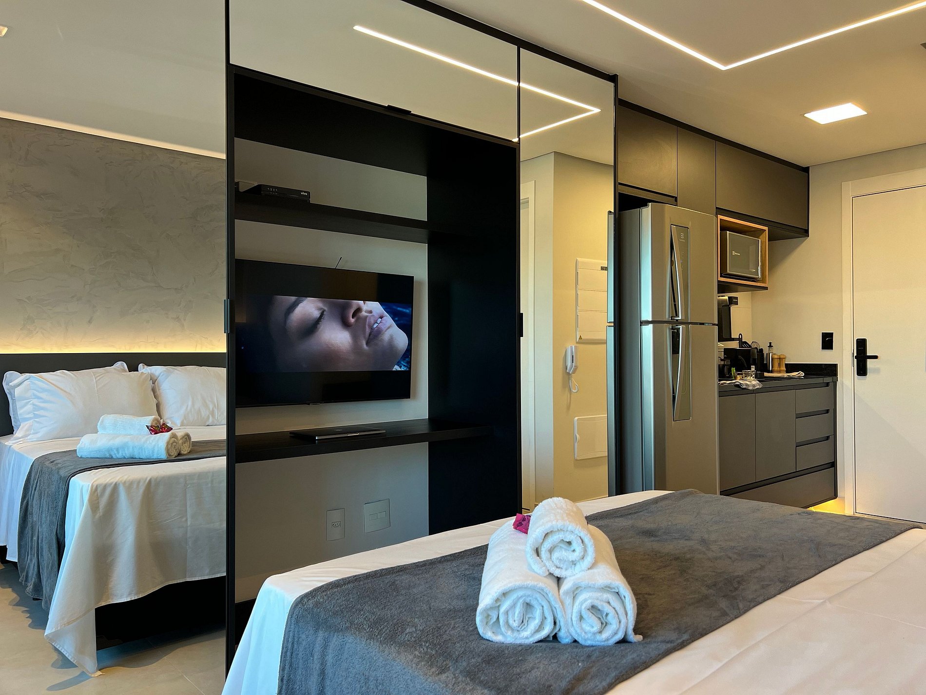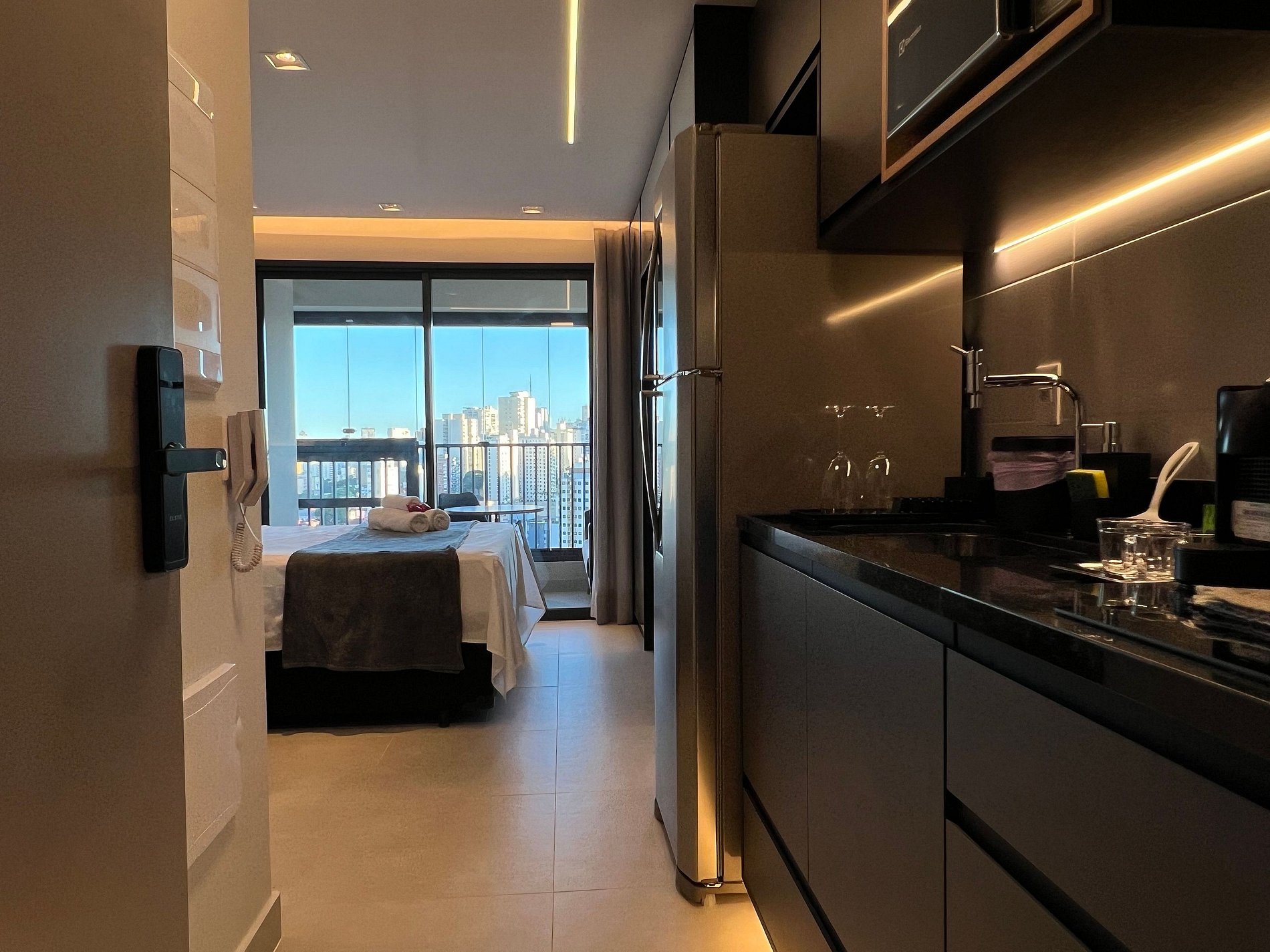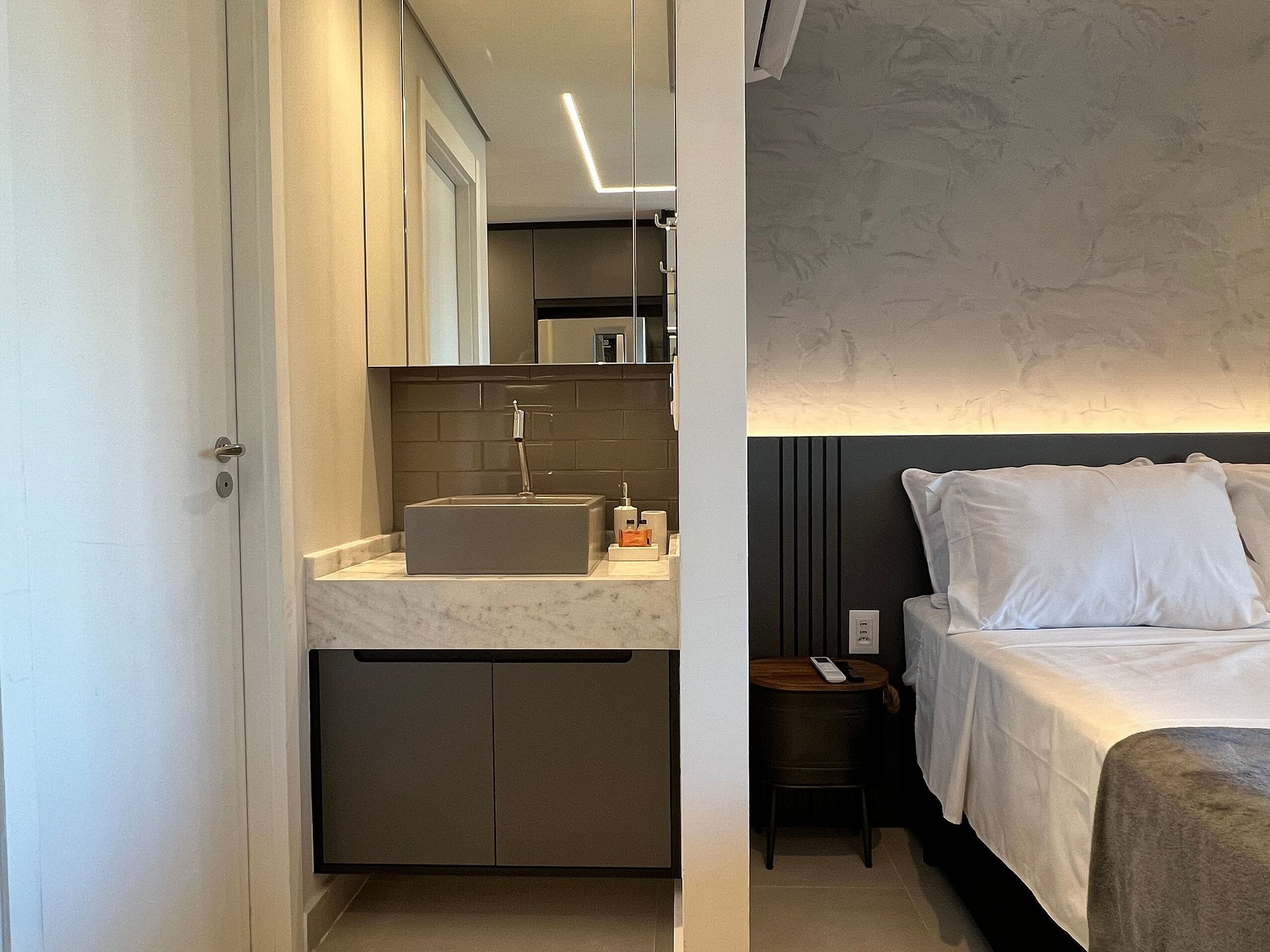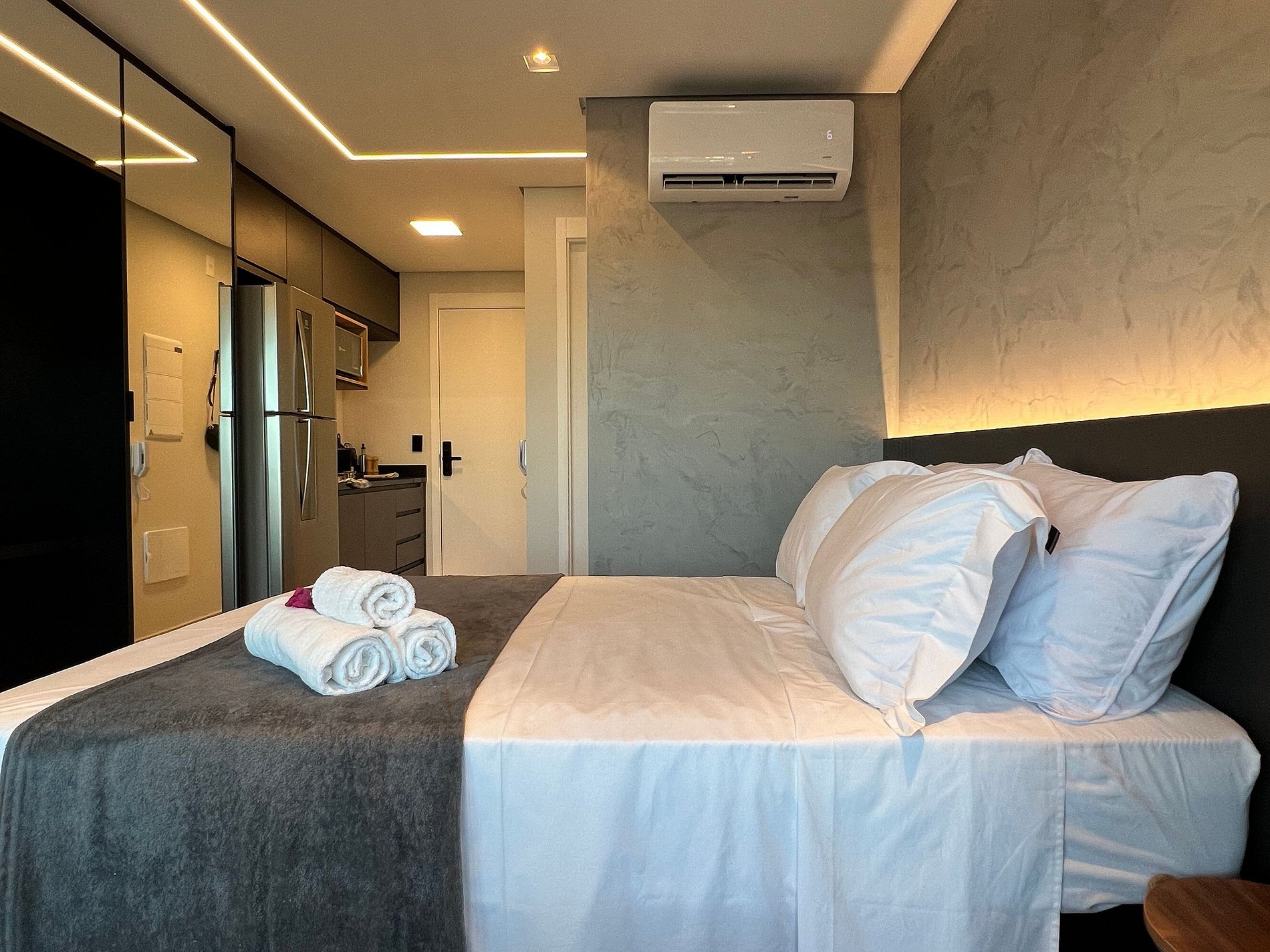 Recém construído, este studio de 25m2, localizado no 23º andar, possui uma atmosfera moderna com decoração funcional, super equipado para atender nossos hóspedes que não abrem mão de conforto e sofisticação em suas estadias.
