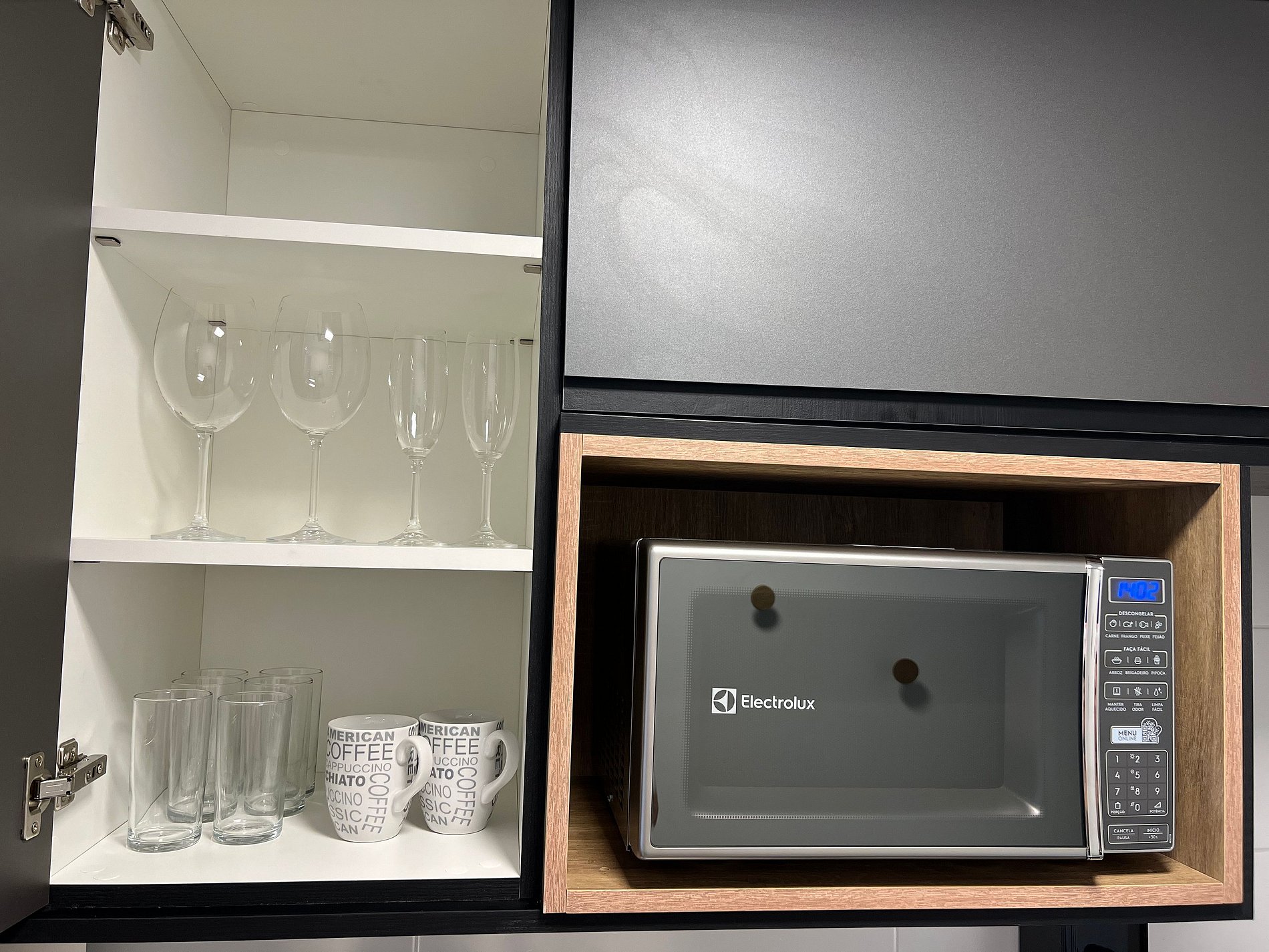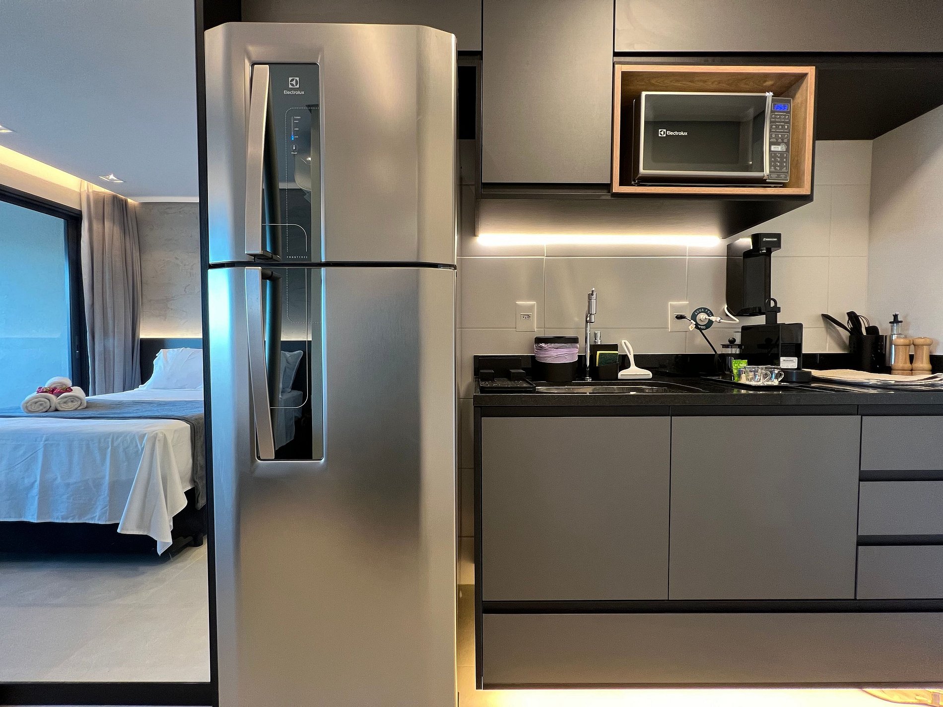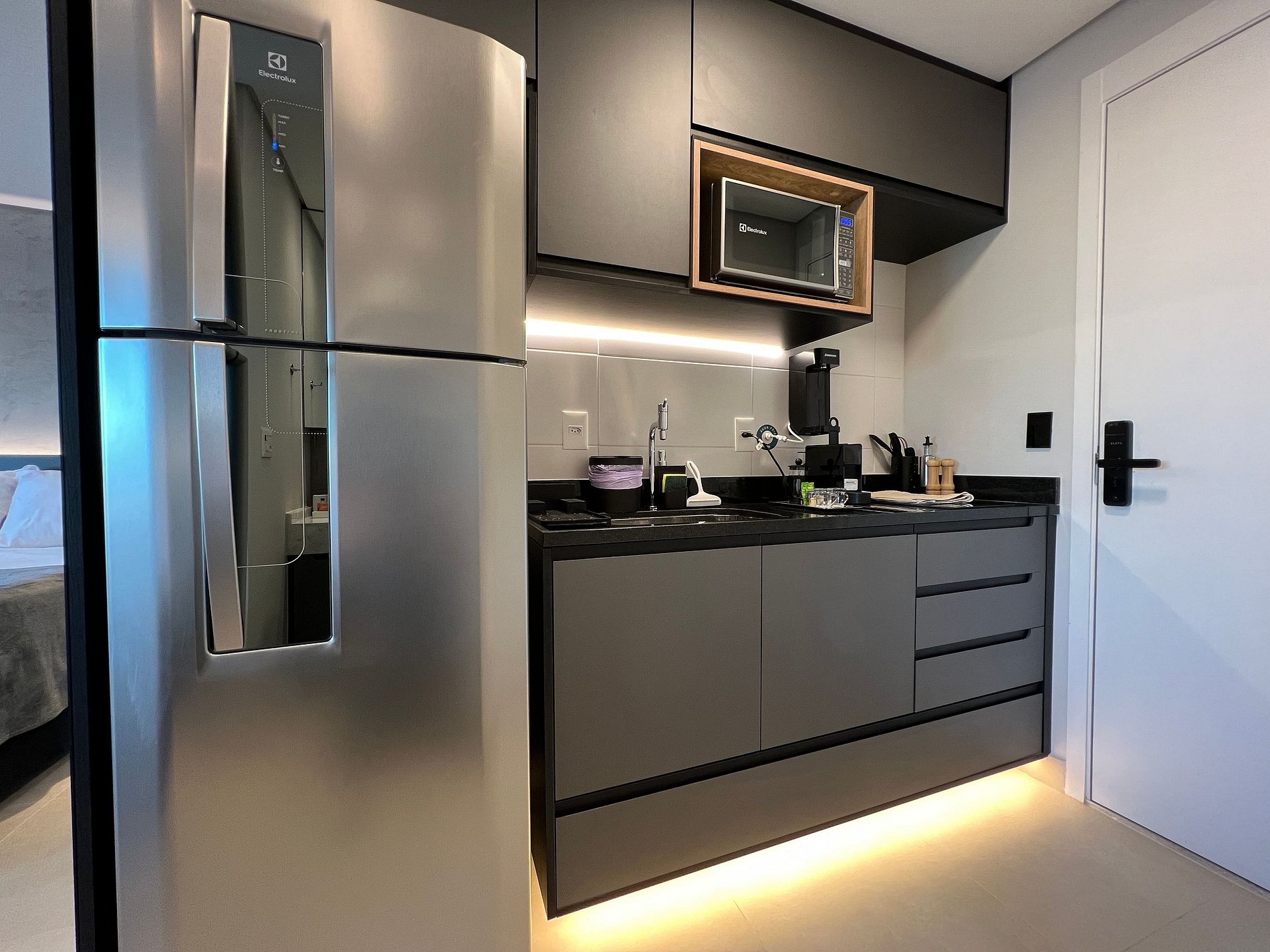 Este studio está repleto de comodidades atendendo hospedagens de curta ou longa temporada.