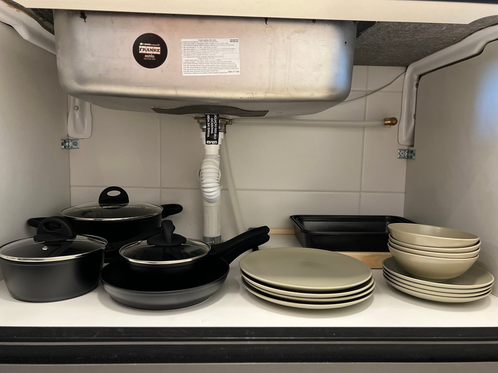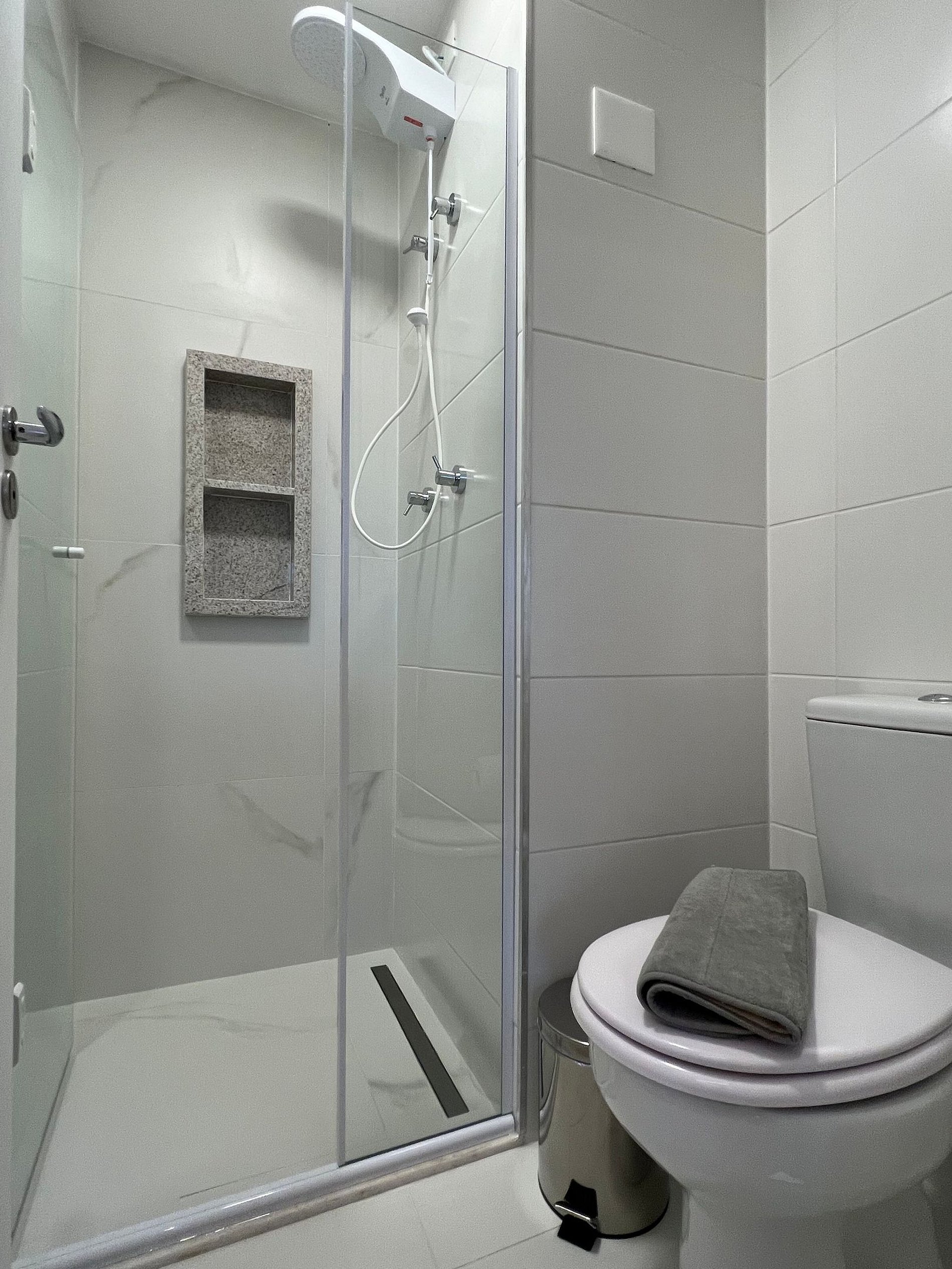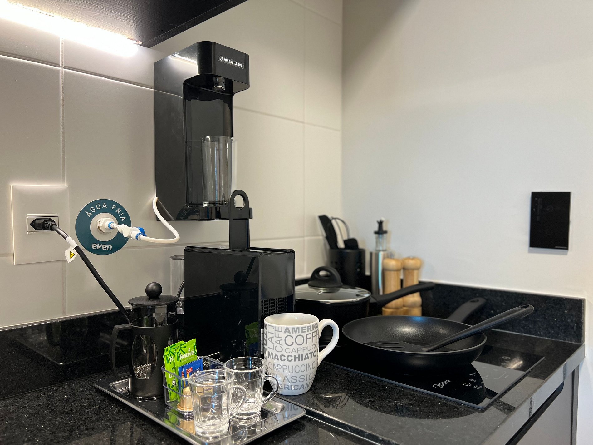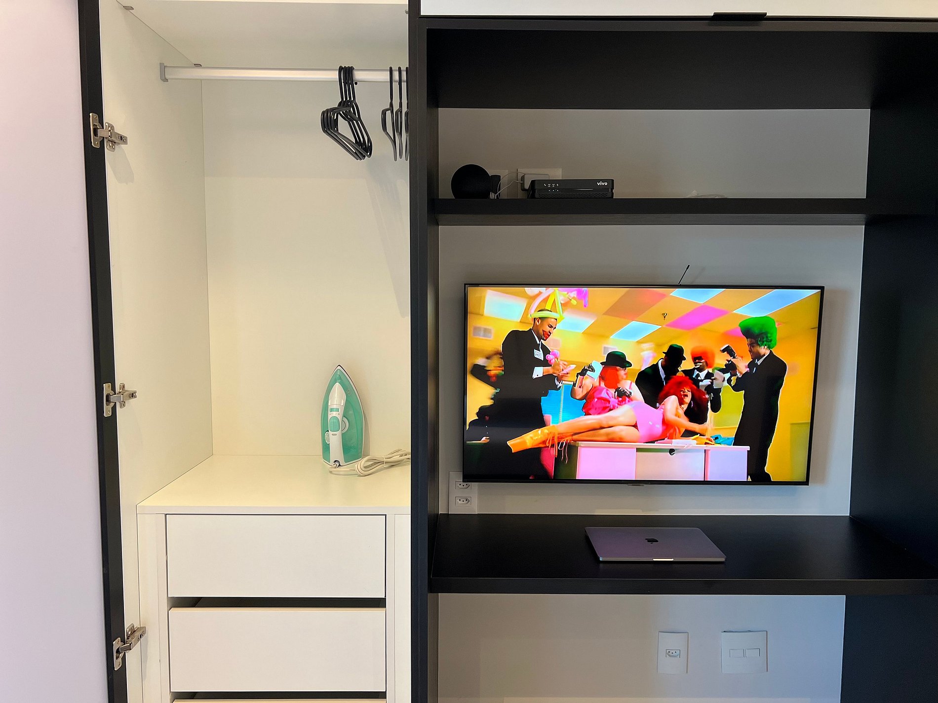 Este studio está repleto de comodidades atendendo hospedagens de curta ou longa temporada.