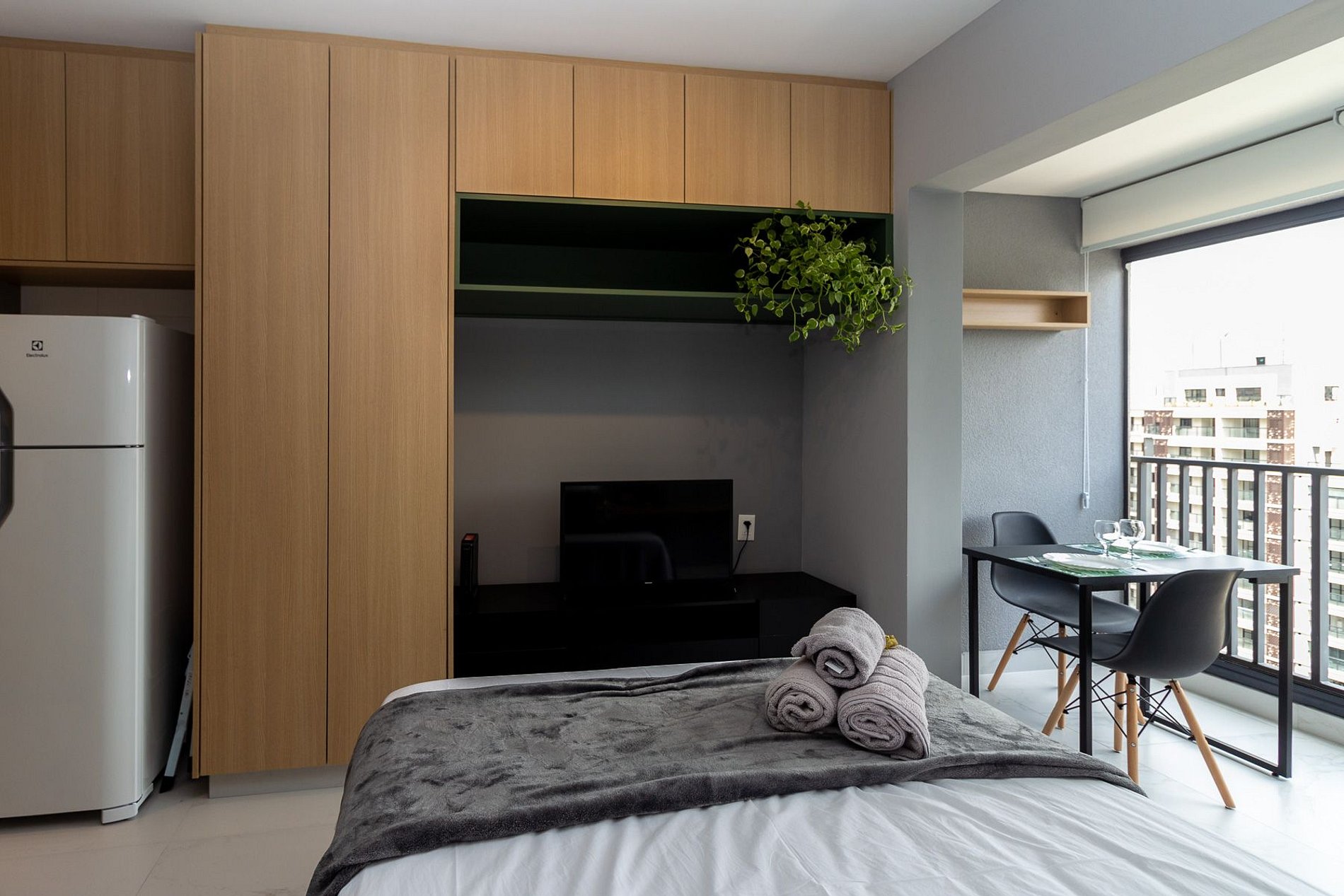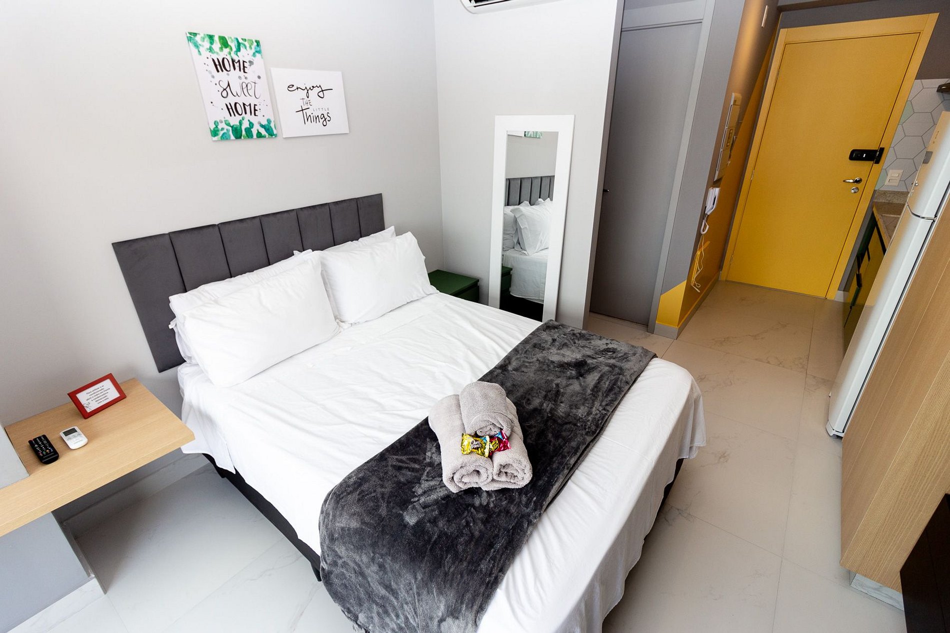 Recém construído, este studio de 25m2 possui uma atmosfera moderna com decoração funcional, super equipado para atender nossos hóspedes que não abrem mão de conforto e sofisticação em suas estadias.