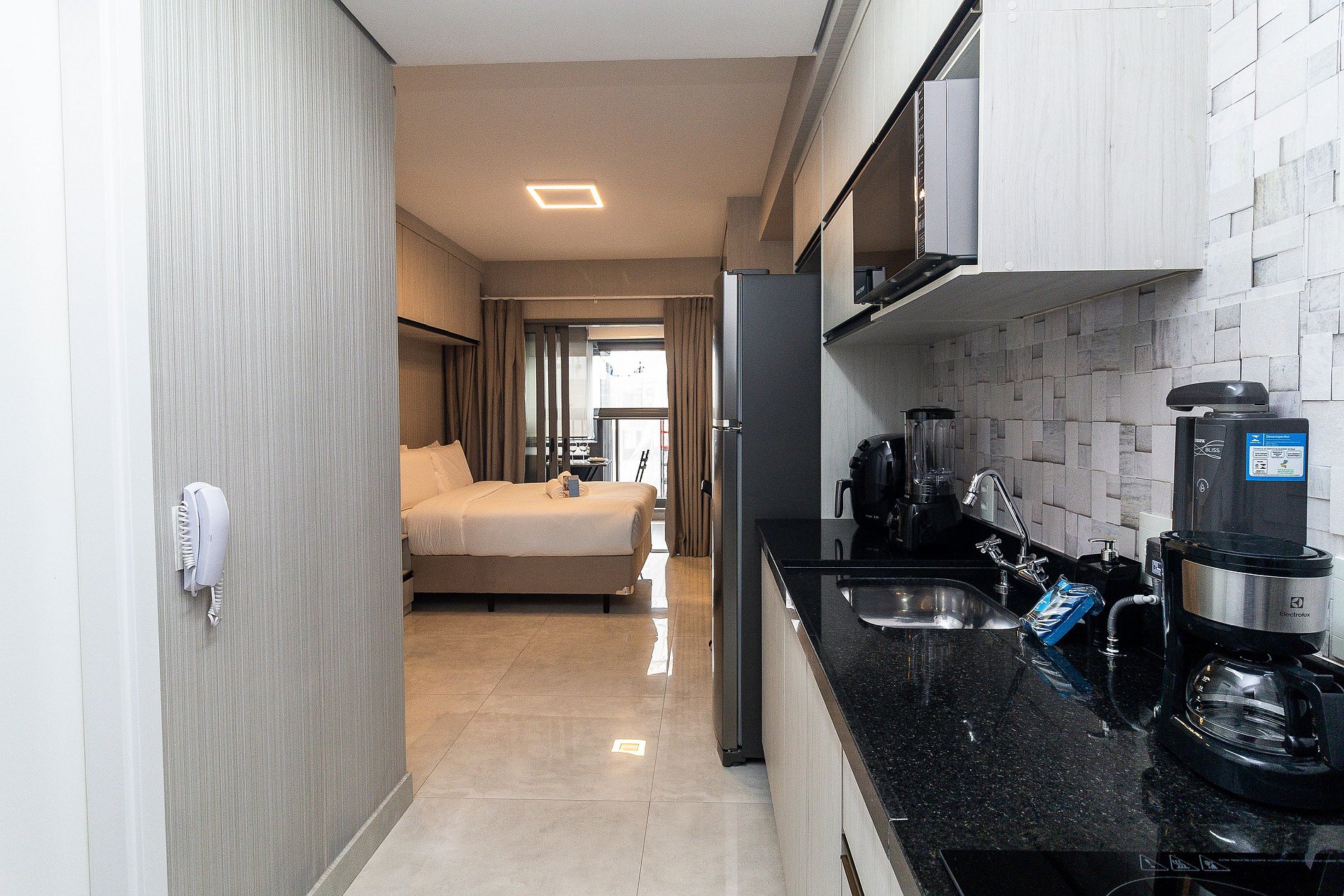 Este studio está repleto de comodidades atendendo hospedagens de curta ou longa temporada.
