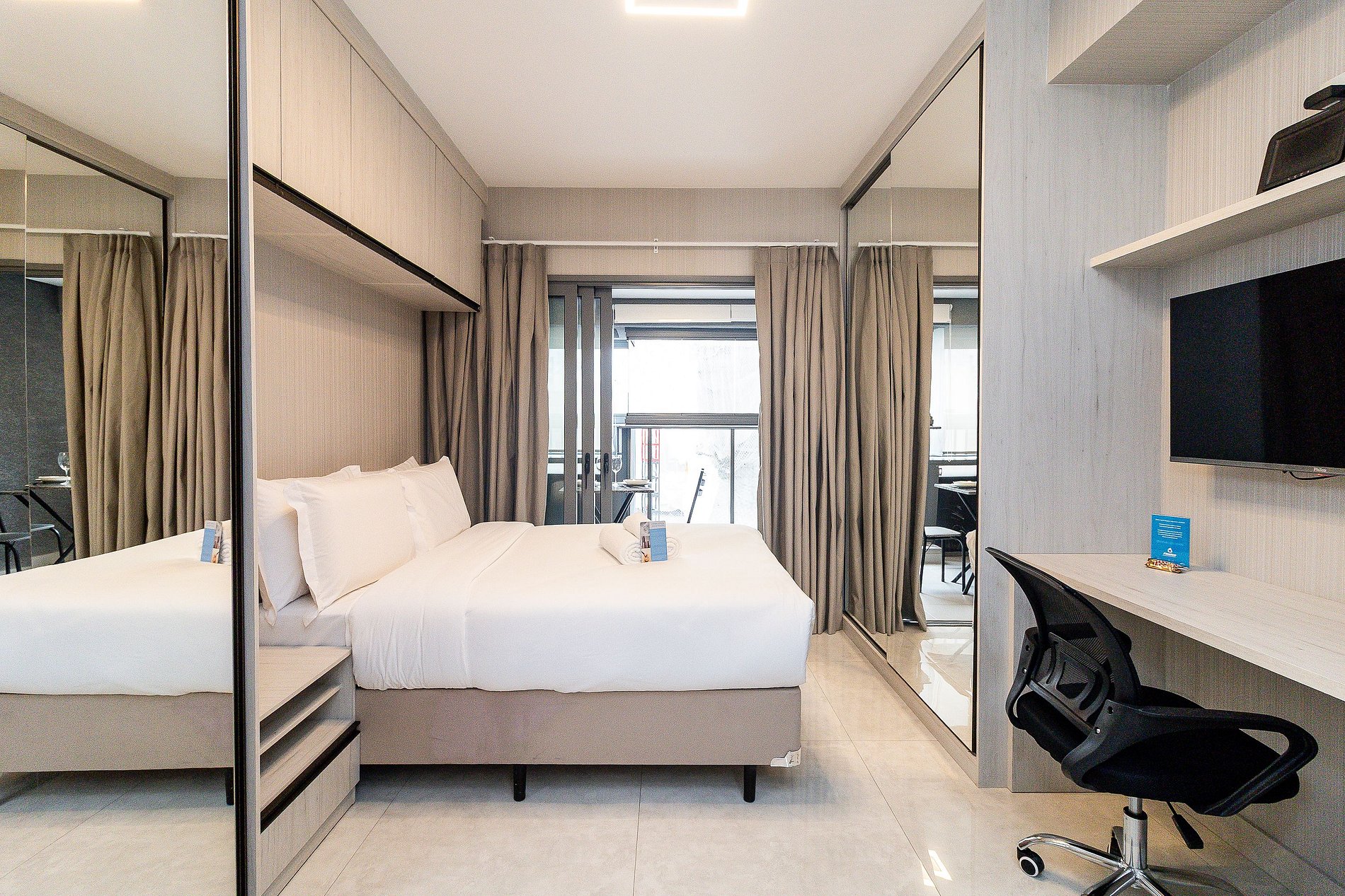 Nosso studio de 31m² localizado na Av. Cotovia possui uma atmosfera moderna com decoração funcional, super equipado para atender nossos hóspedes que não abrem mão de conforto em suas estadias.