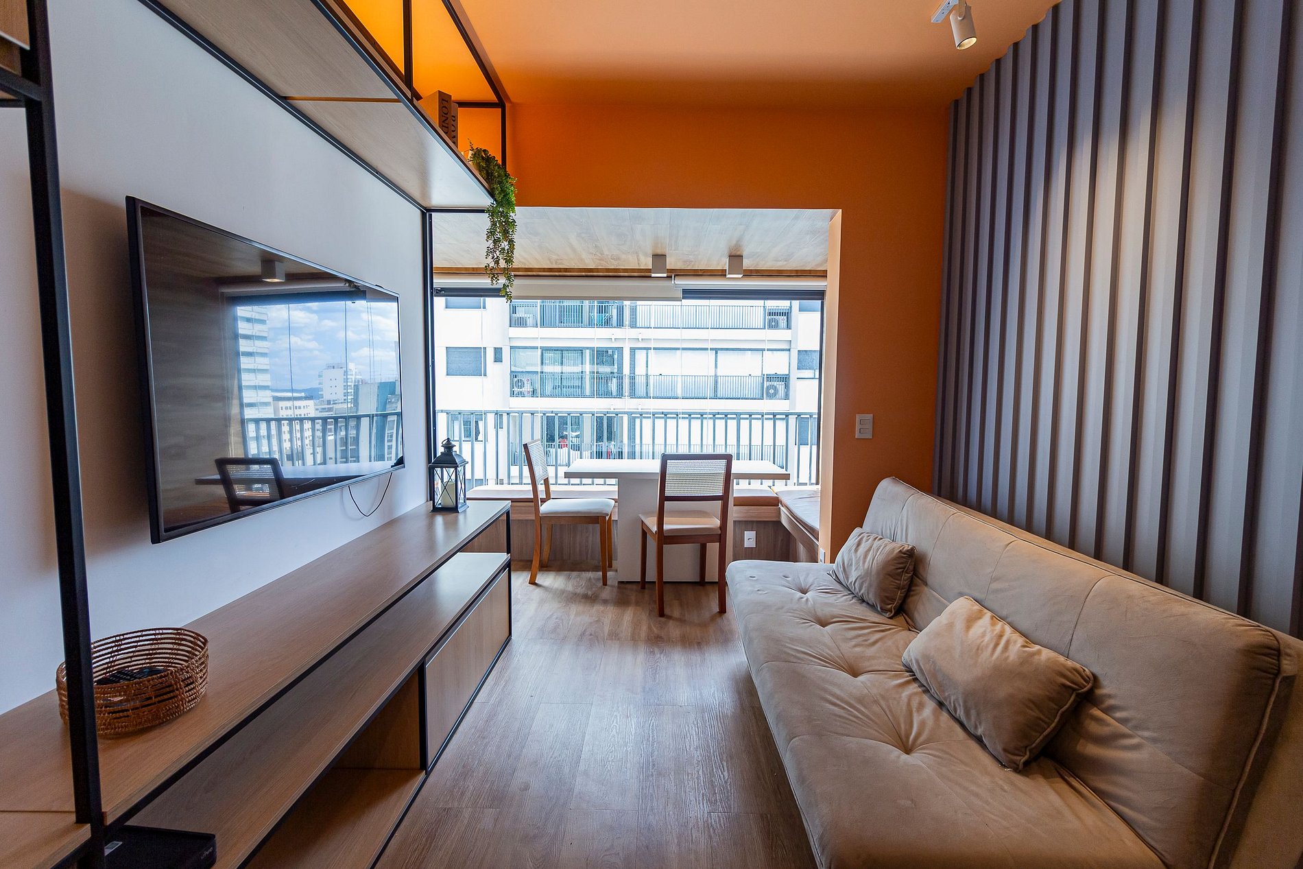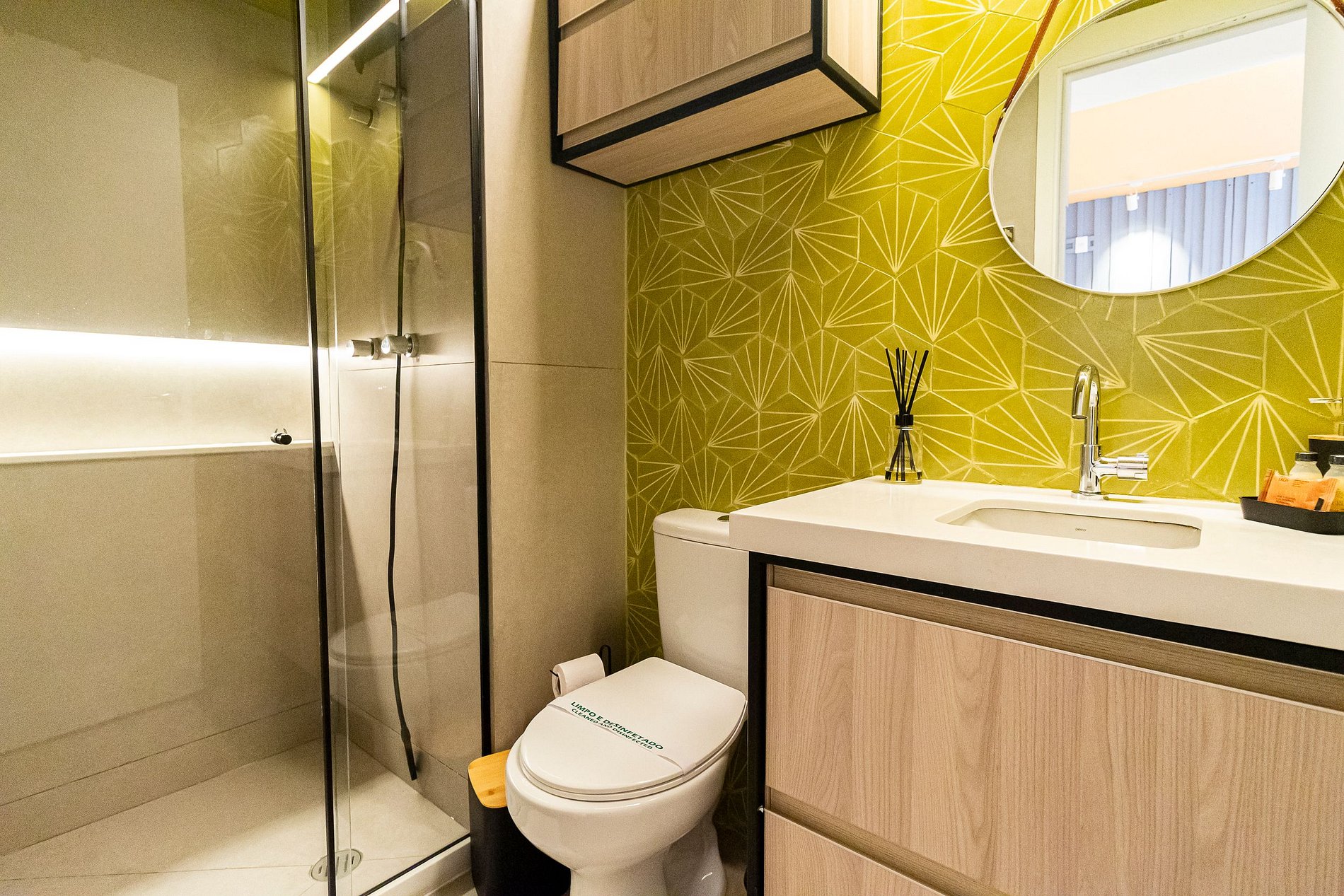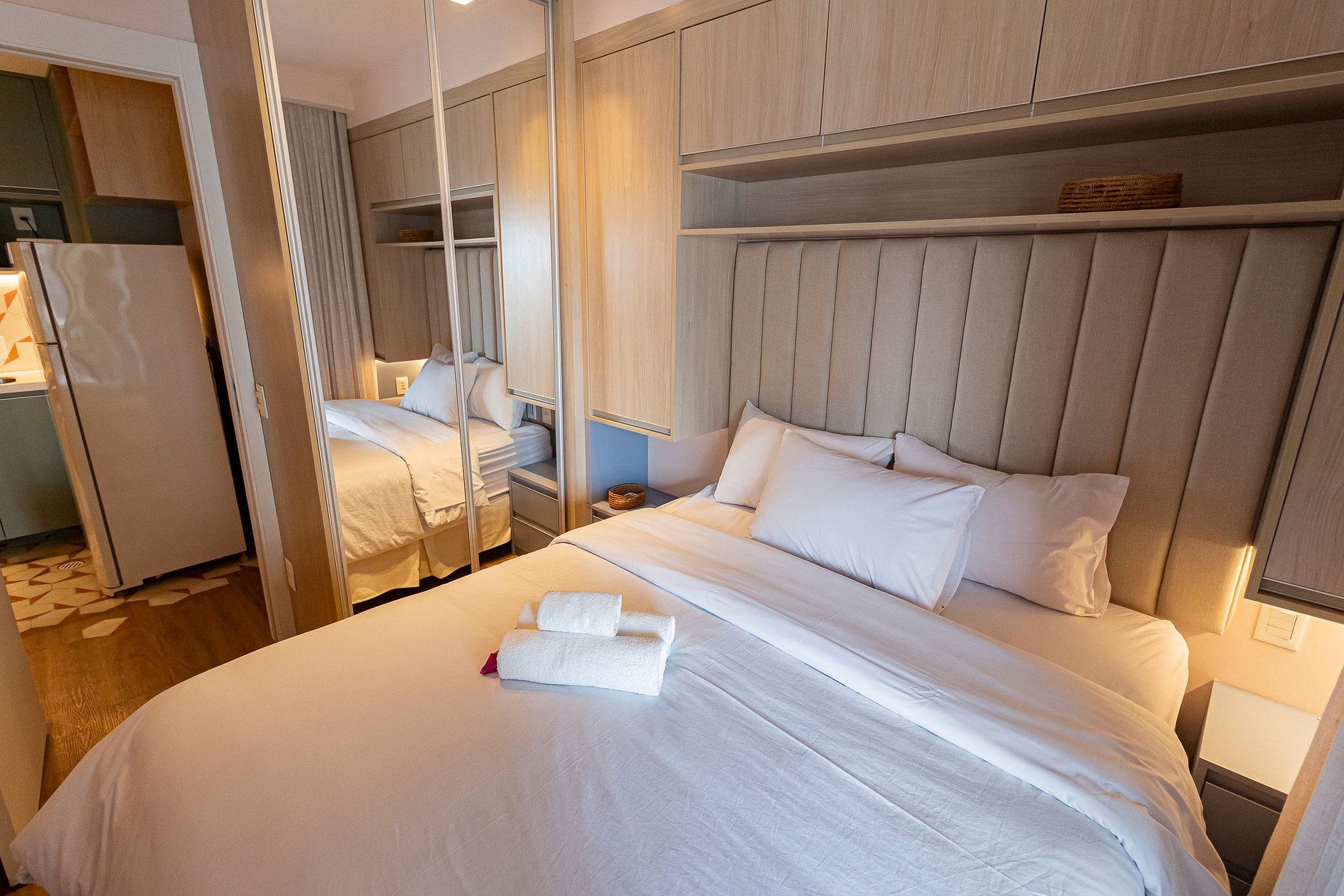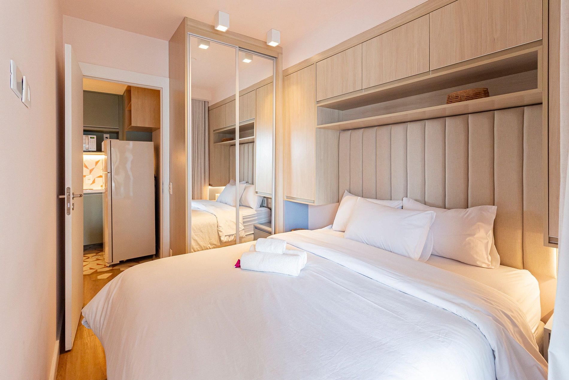 Nosso amplo studio de 40m² possui uma atmosfera moderna com decoração sofisticada, super equipado para atender nossos hóspedes que não abrem mão de conforto e sofisticação em suas estadias, estando pronto para acomodar até 3 pessoas confortavelmente em estadias de longa ou curta duração.