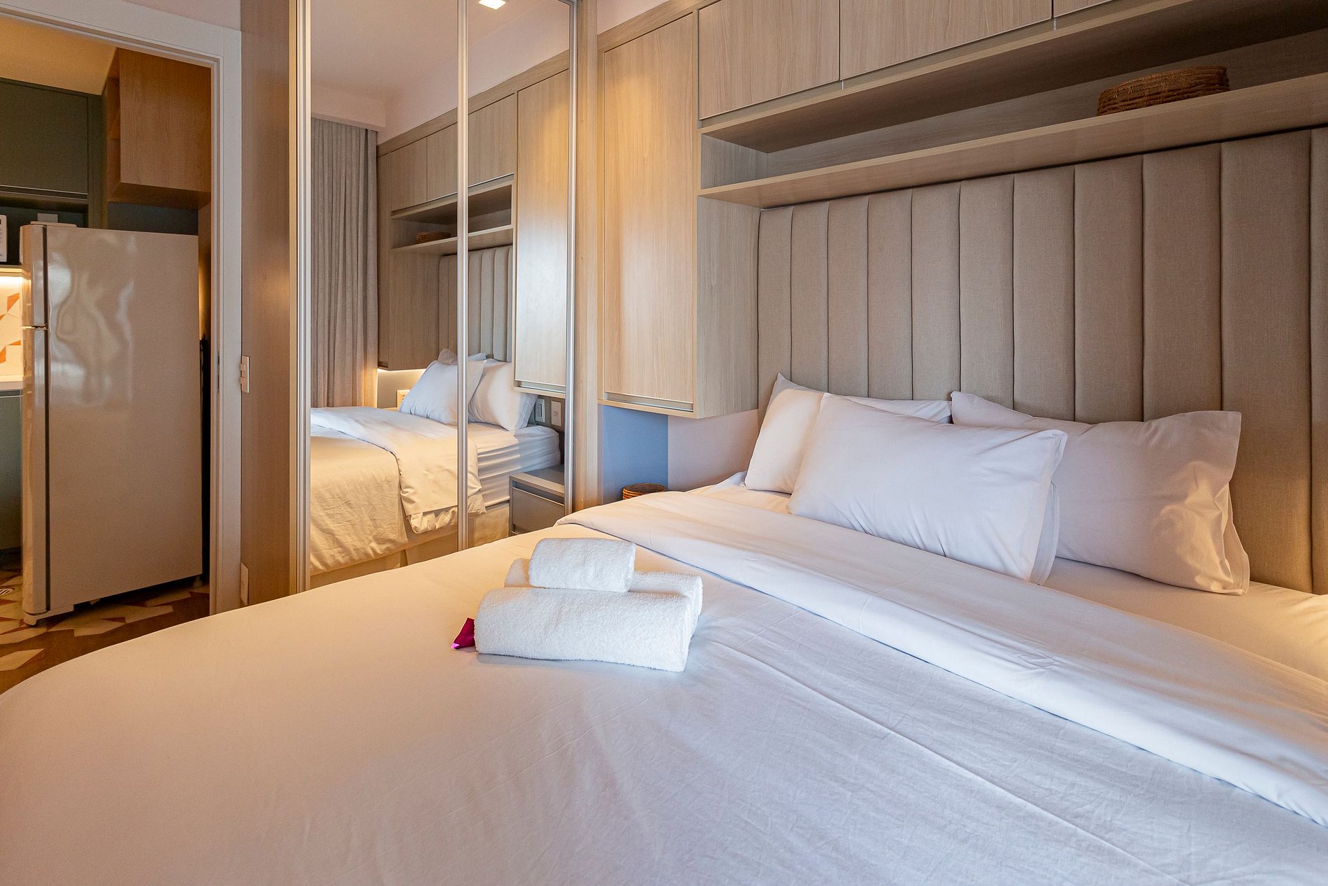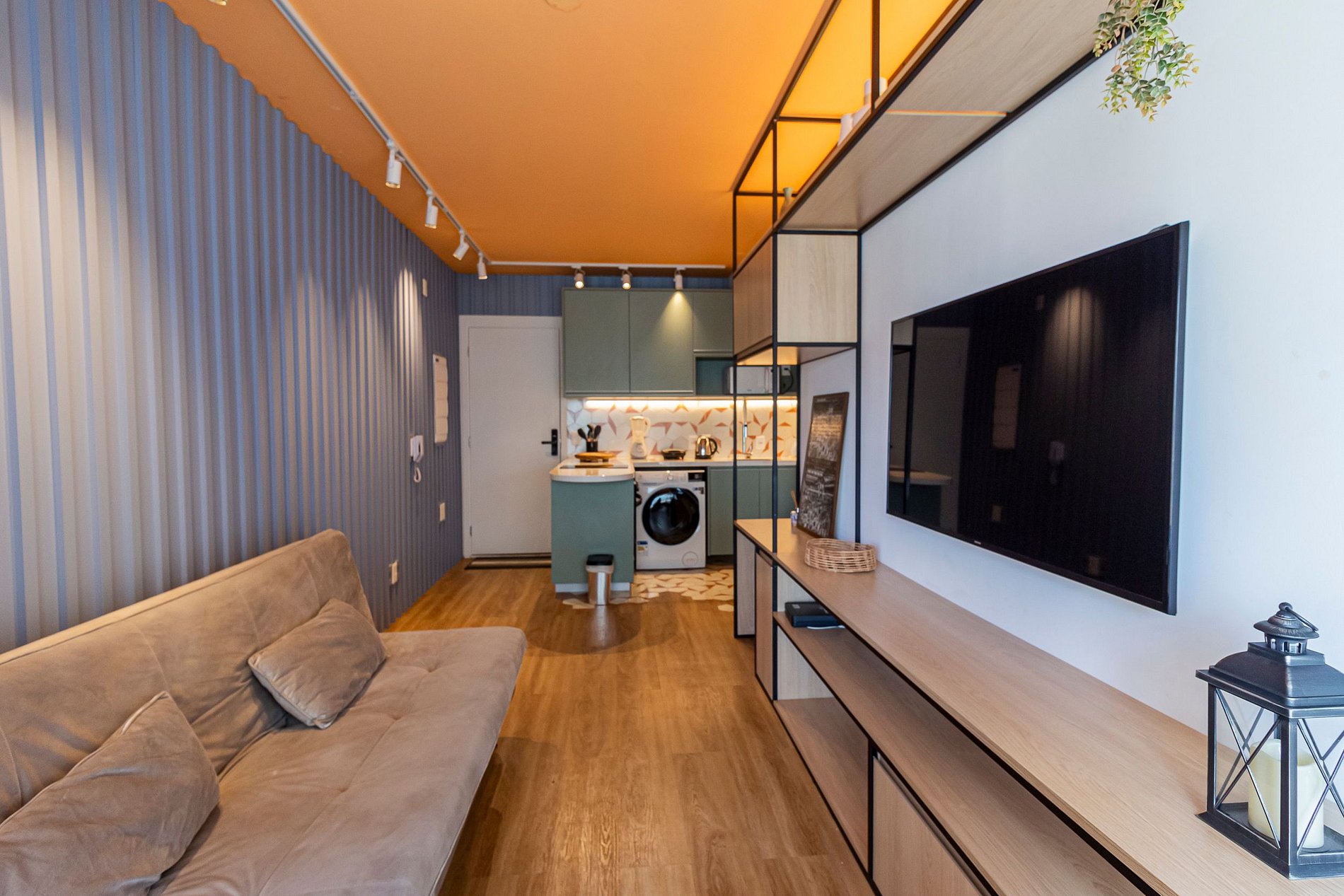 Nosso amplo studio de 40m² possui uma atmosfera moderna com decoração sofisticada, super equipado para atender nossos hóspedes que não abrem mão de conforto e sofisticação em suas estadias, estando pronto para acomodar até 3 pessoas confortavelmente em estadias de longa ou curta duração.