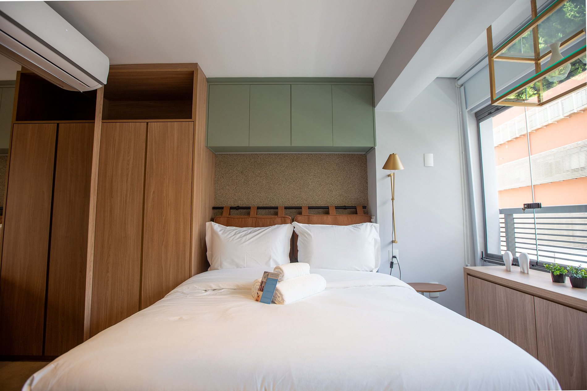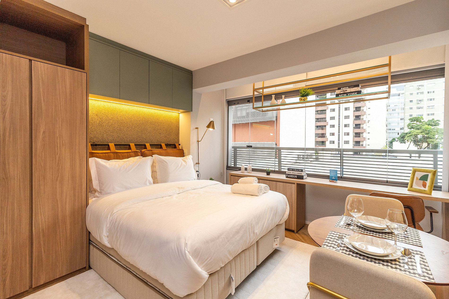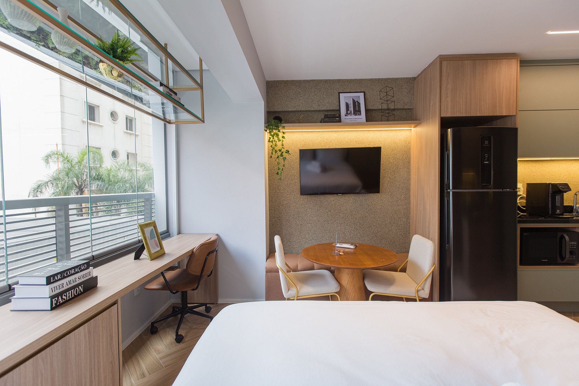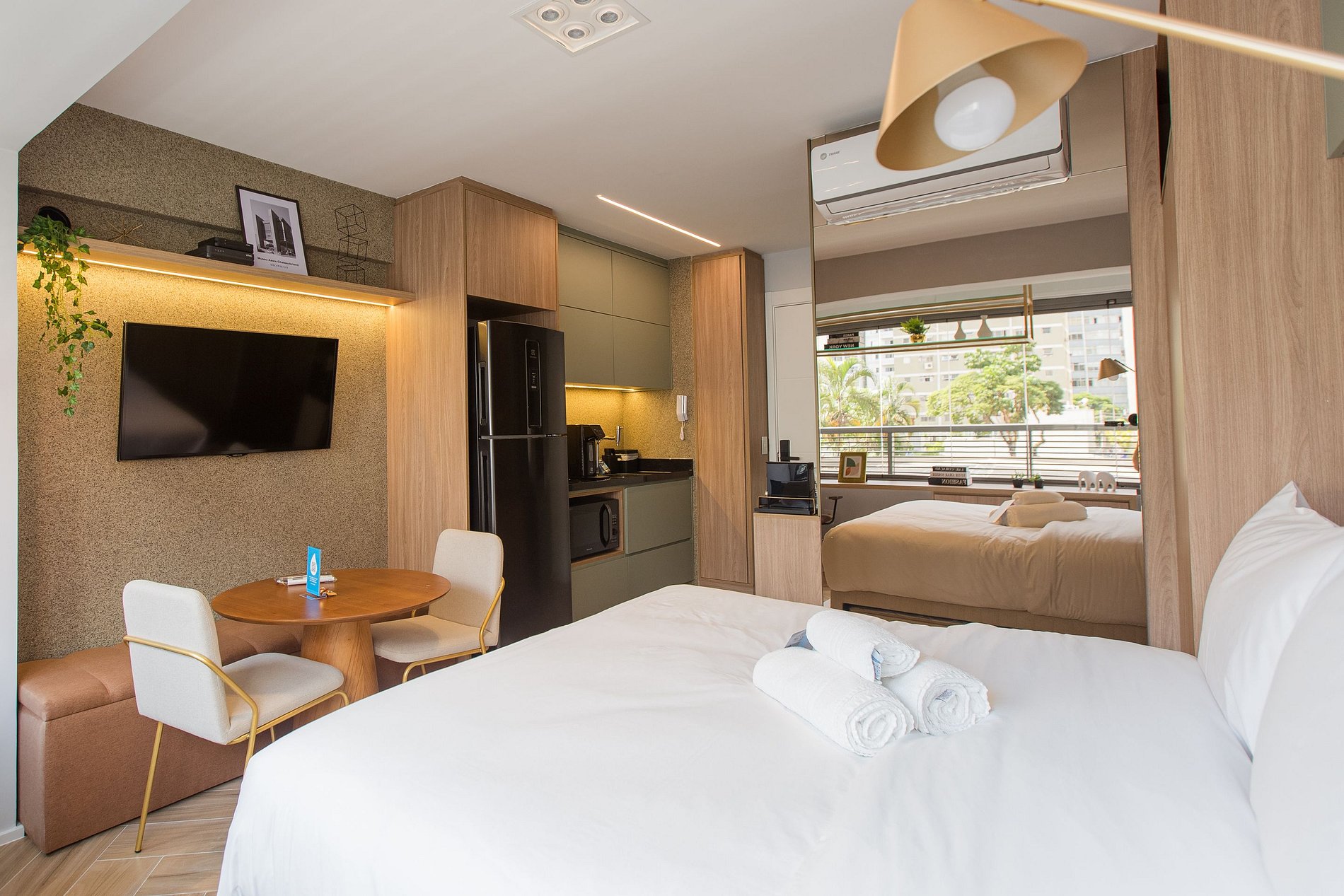 A combinação perfeita entre sofisticação, funcionalidade e conforto! A decoração moderna e elegante desse studio de 22m² cria um ambiente acolhedor e charmoso. Cada detalhe foi pensado para oferecer uma experiência confortável, prática e estilosa aos nossos hóspedes de estadias curtas ou de longa duração.