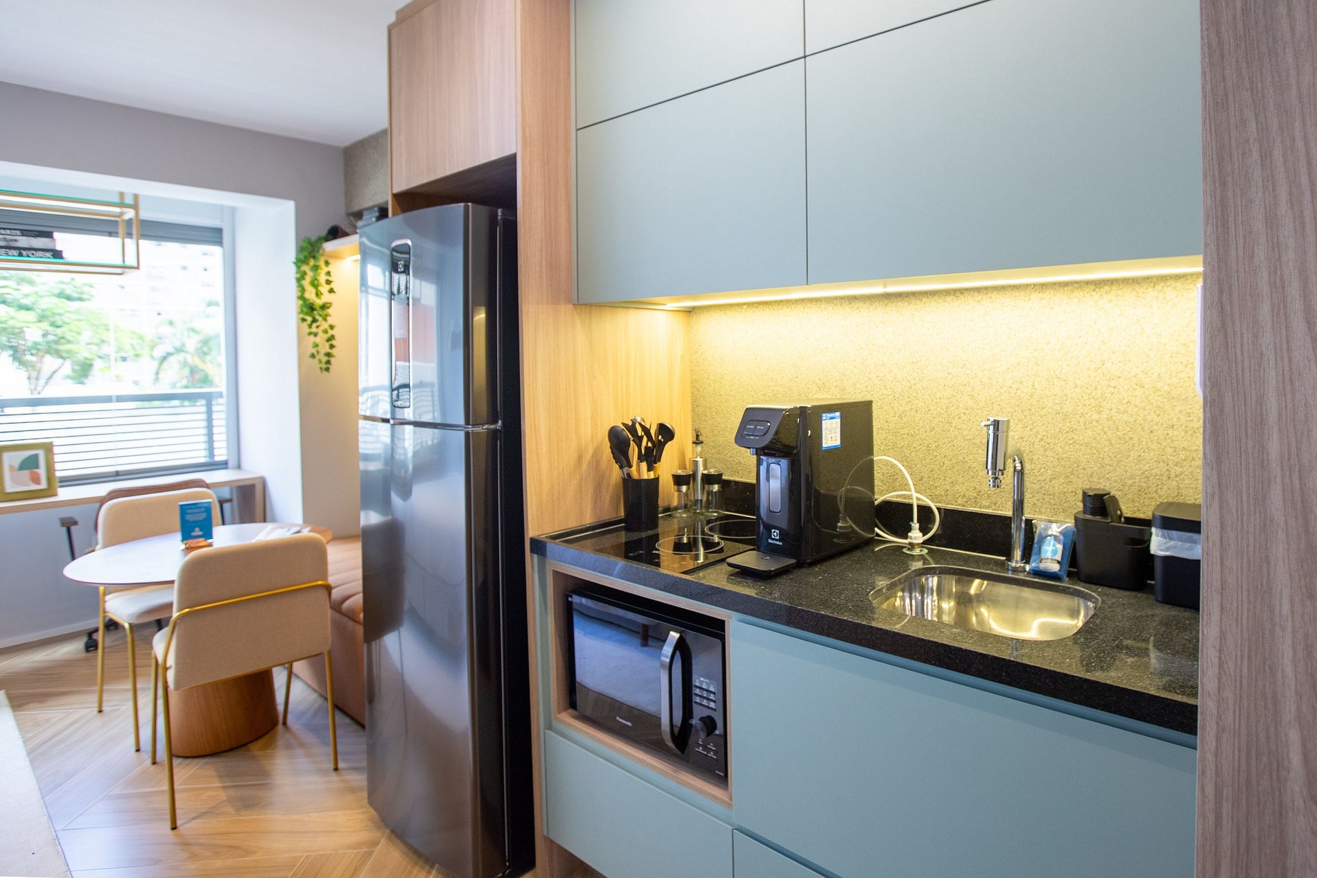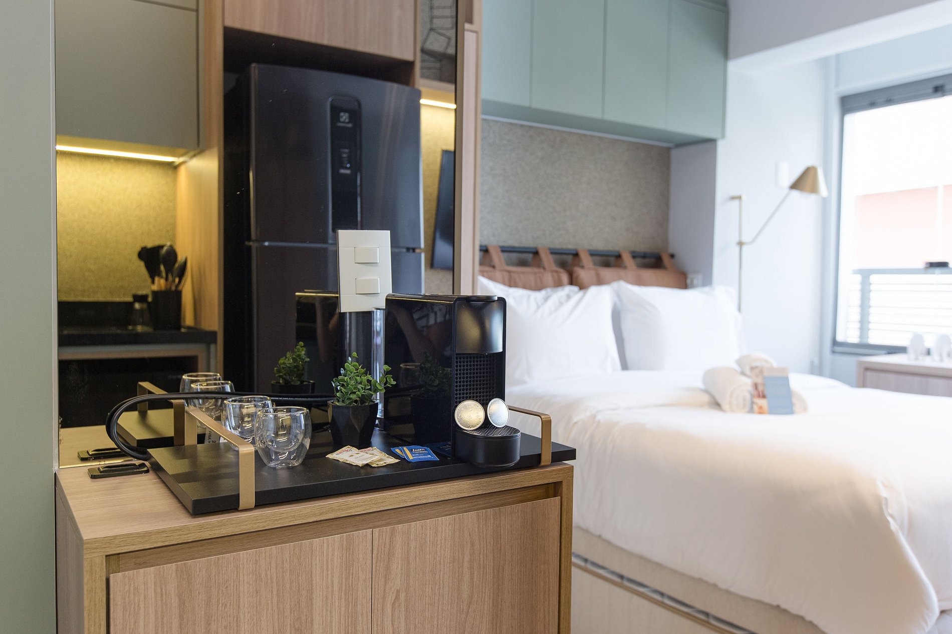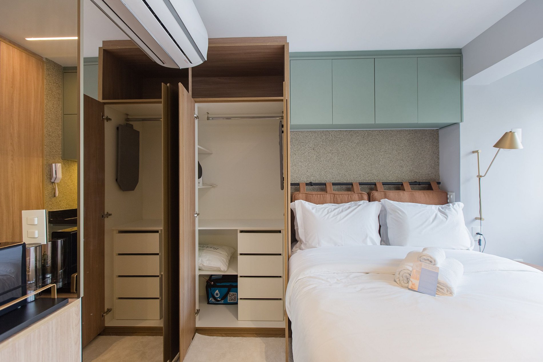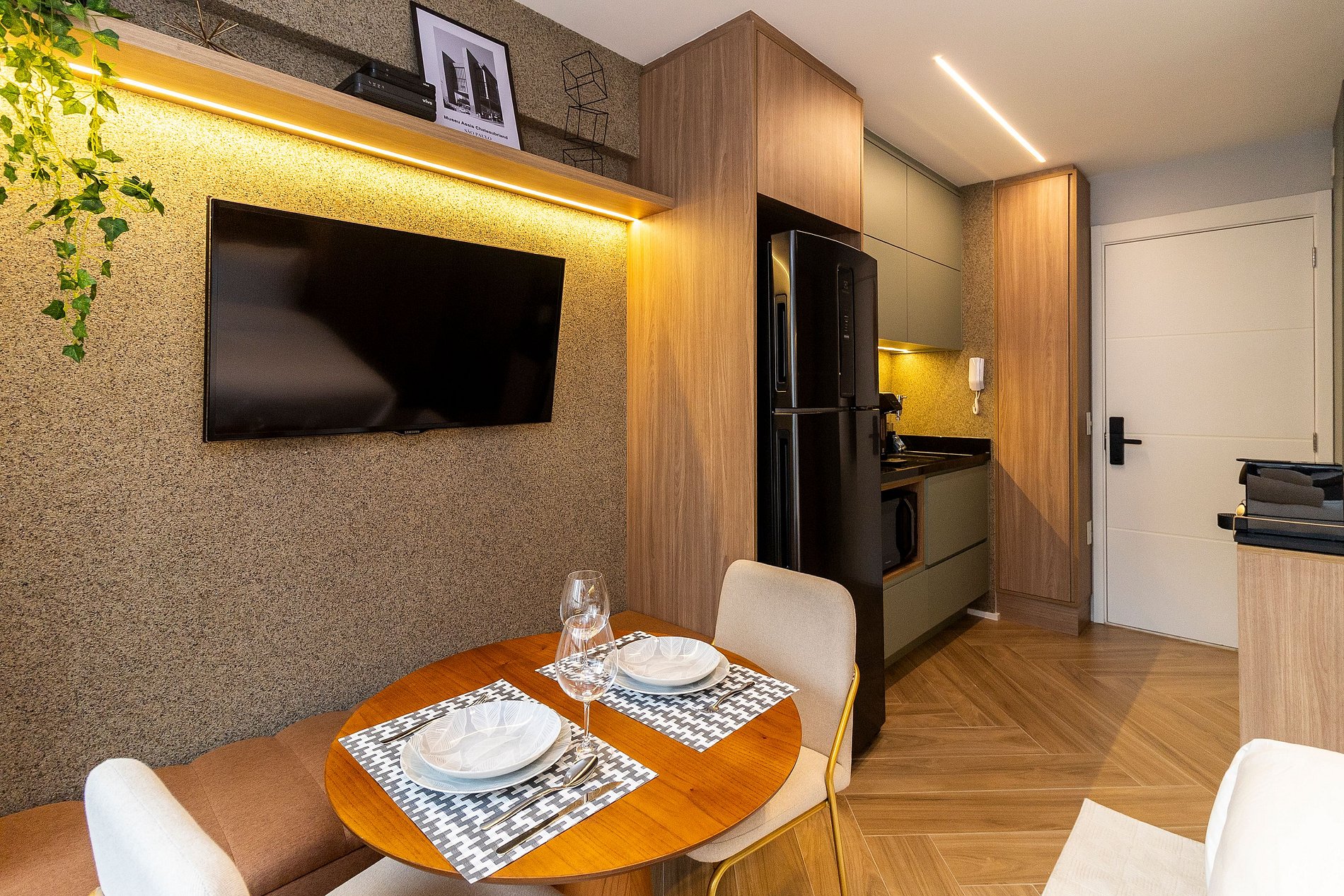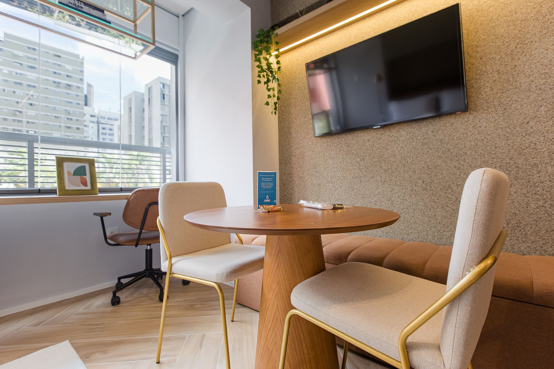 A combinação perfeita entre sofisticação, funcionalidade e conforto! A decoração moderna e elegante desse studio de 22m² cria um ambiente acolhedor e charmoso. Cada detalhe foi pensado para oferecer uma experiência confortável, prática e estilosa aos nossos hóspedes de estadias curtas ou de longa duração.