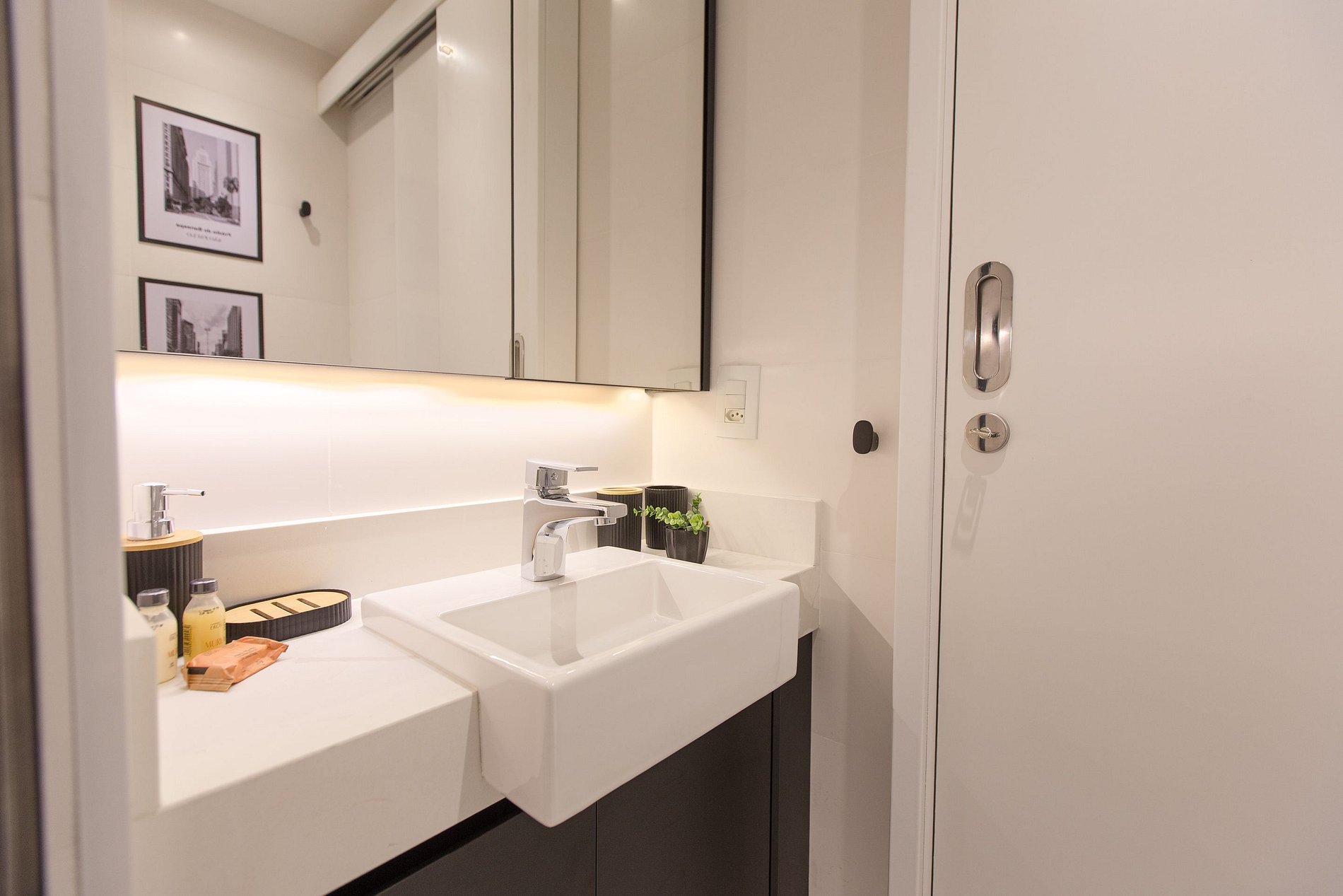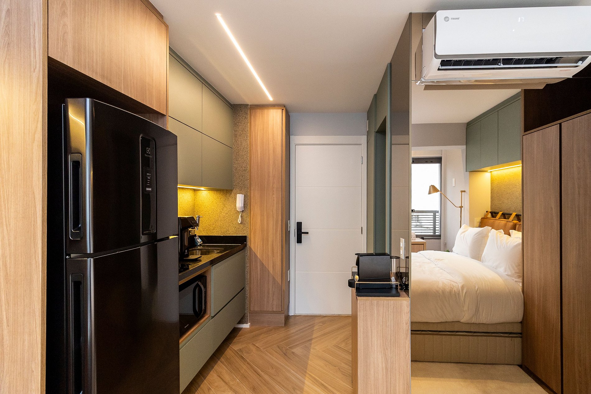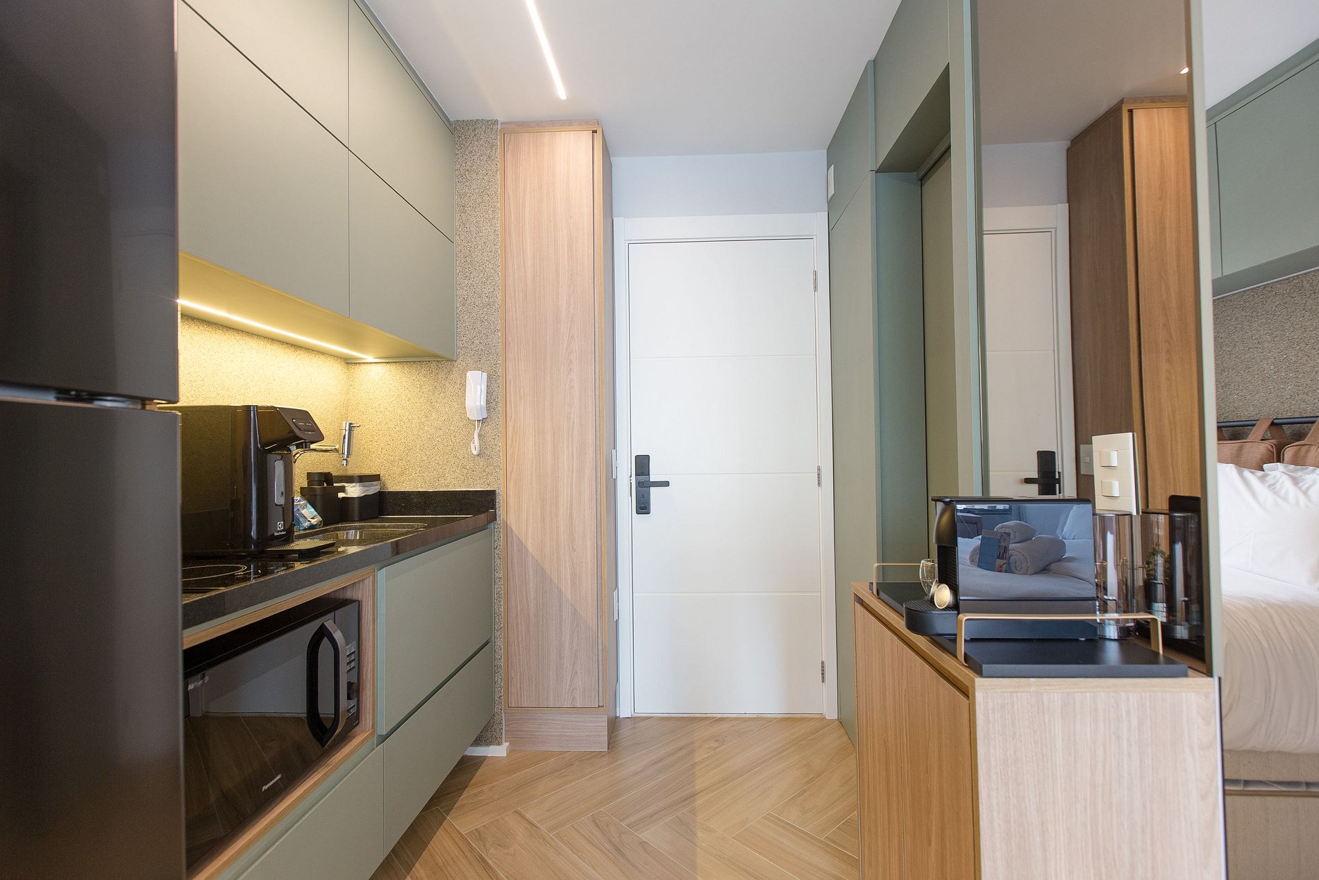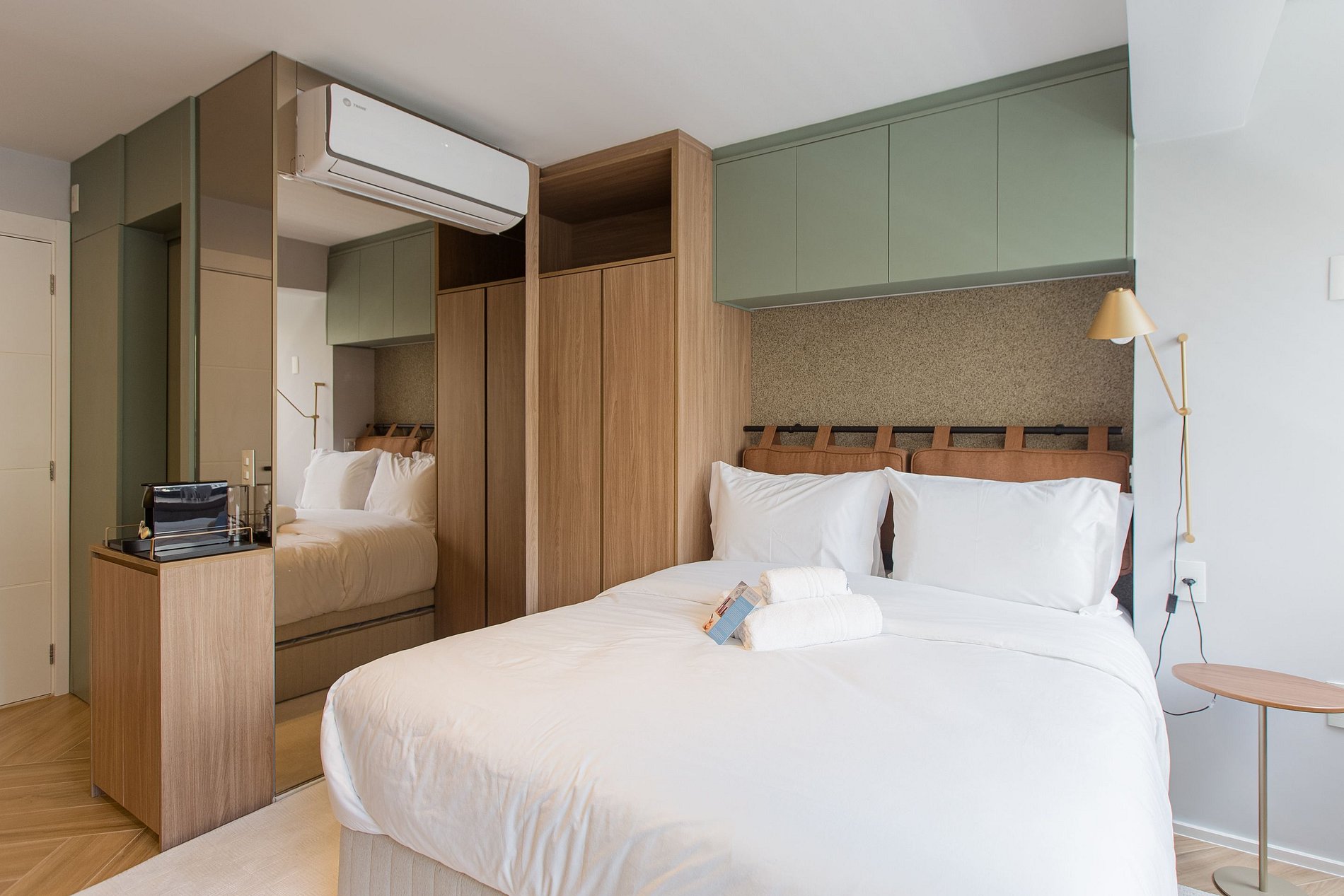 A combinação perfeita entre sofisticação, funcionalidade e conforto! A decoração moderna e elegante desse studio de 22m² cria um ambiente acolhedor e charmoso. Cada detalhe foi pensado para oferecer uma experiência confortável, prática e estilosa aos nossos hóspedes de estadias curtas ou de longa duração.