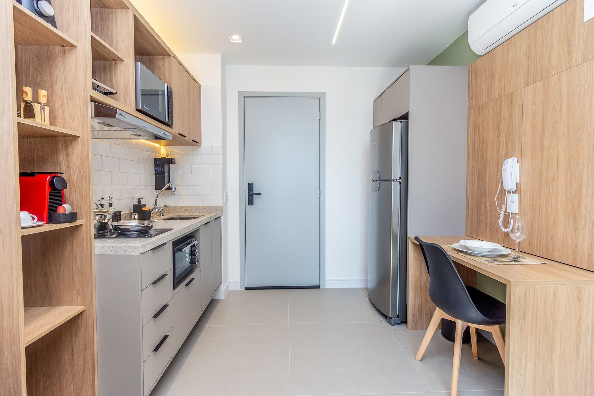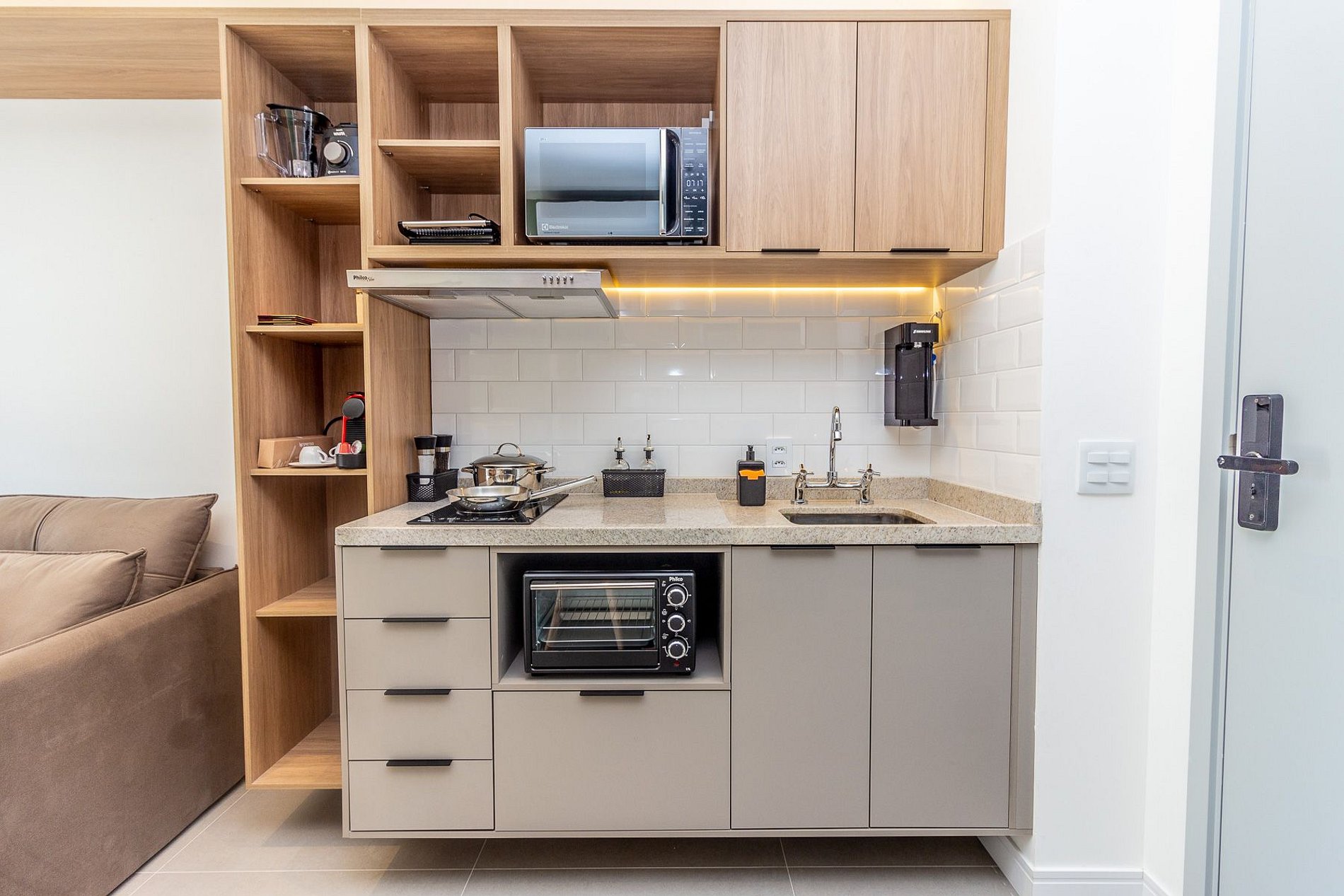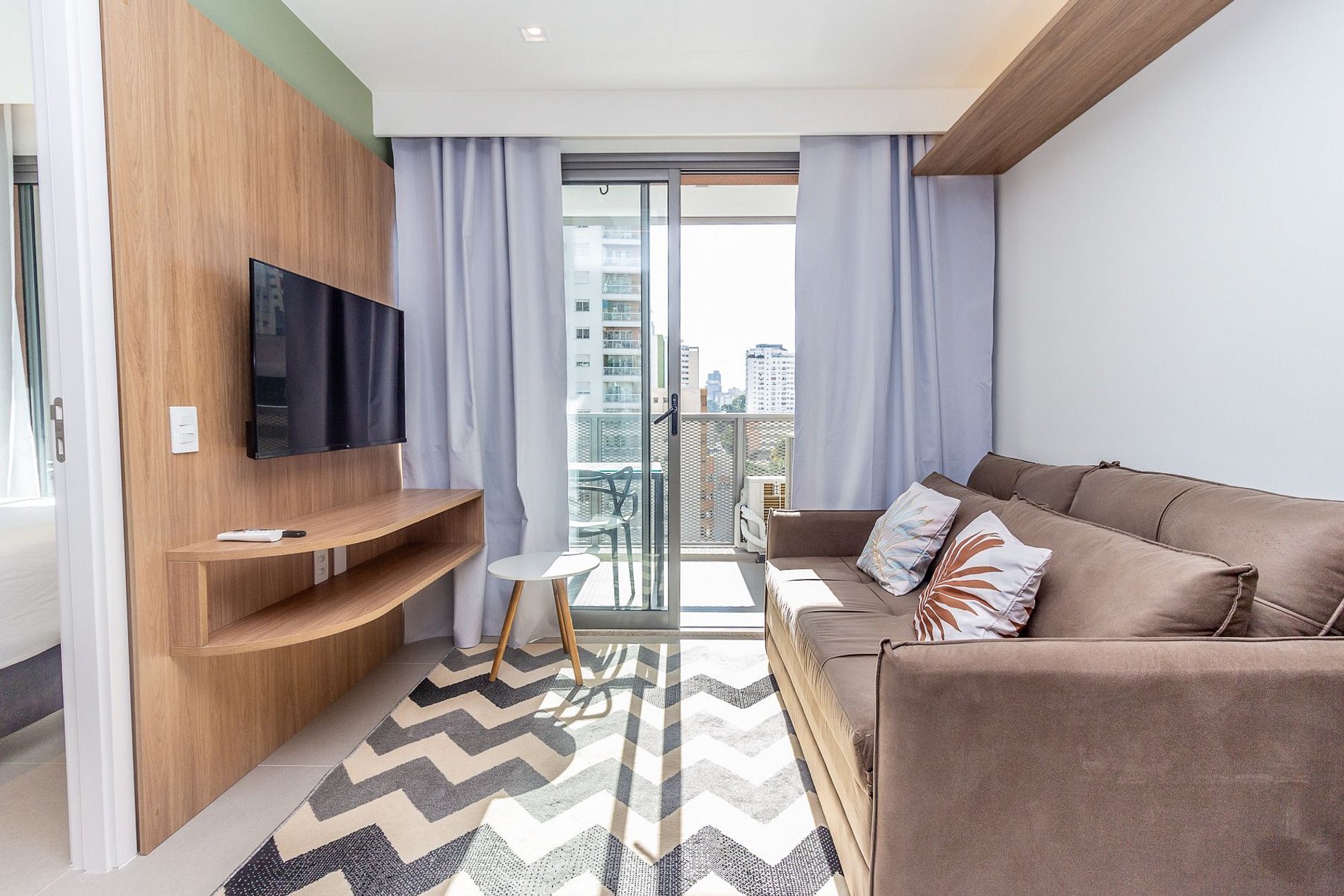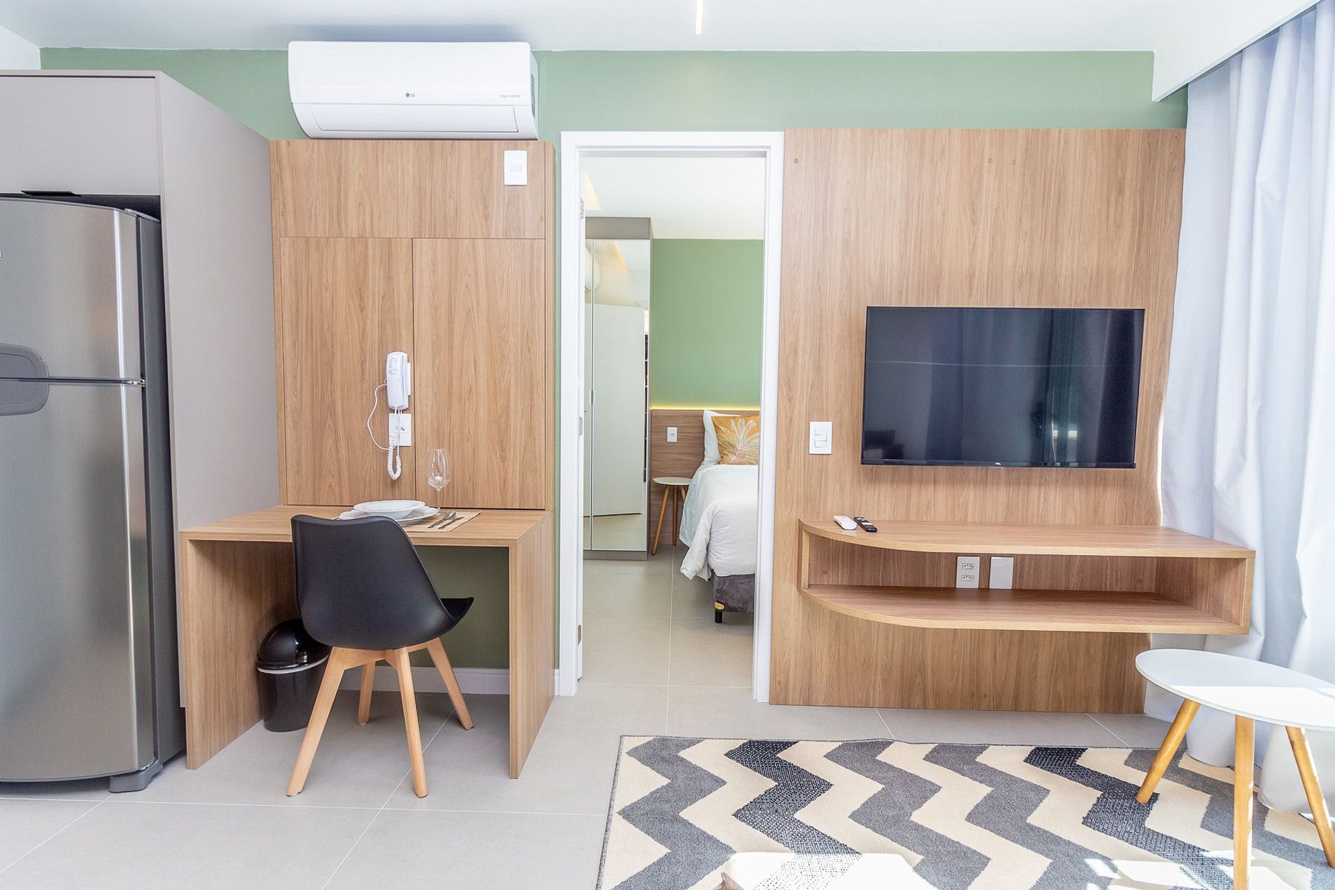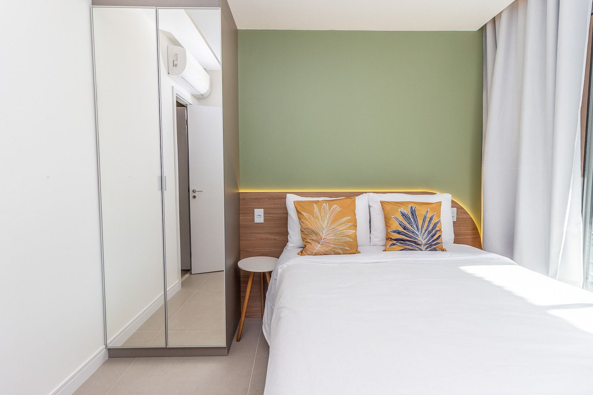 Novíssimo studio de 35m² com decoração moderna, foi preparado para hospedar confortavelmente até 4 pessoas. Super equipado para atender nossos hóspedes que não abrem mão de conforto e sofisticação em suas estadias, repleto de comodidades atendendo hospedagens de curta ou longa temporada.