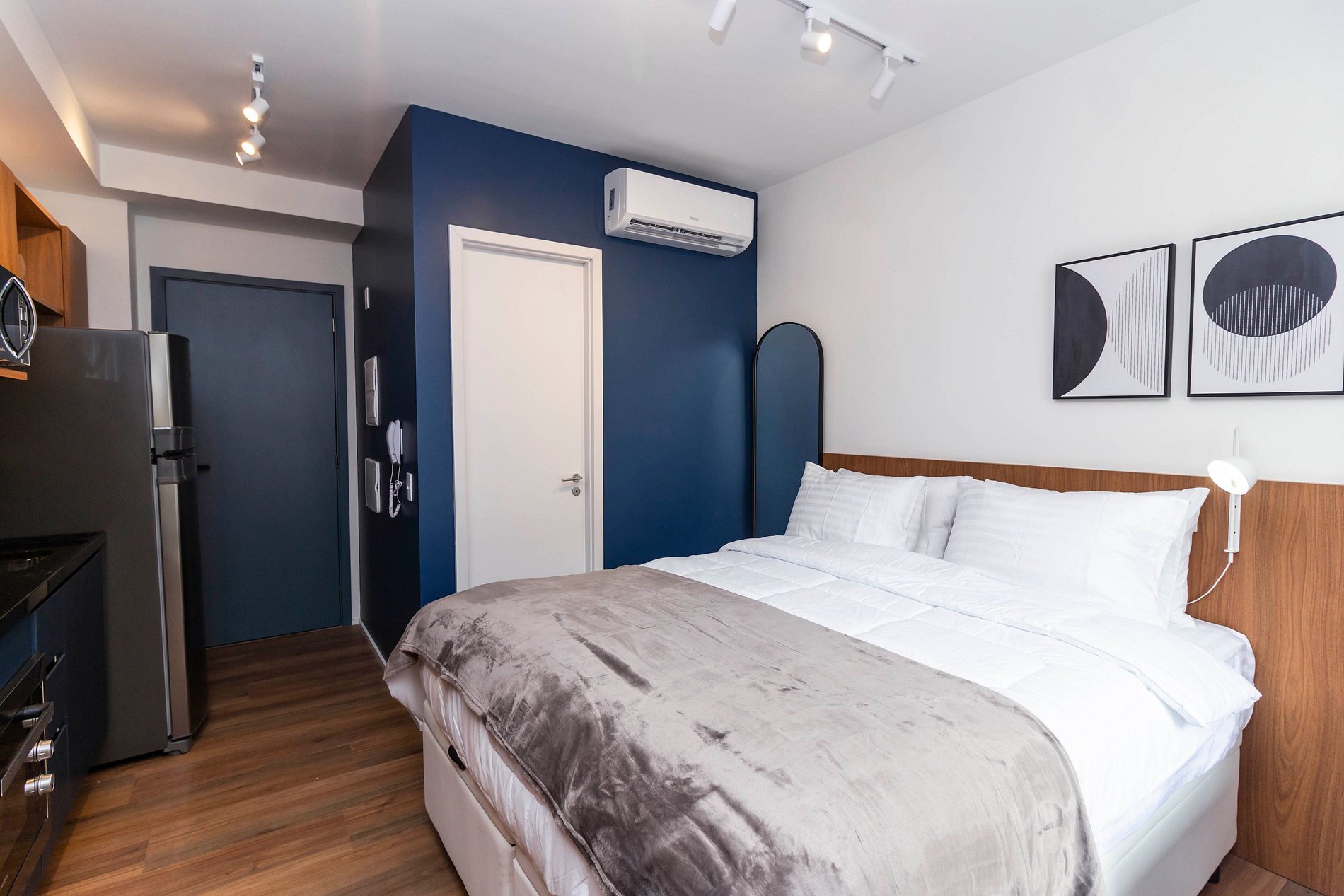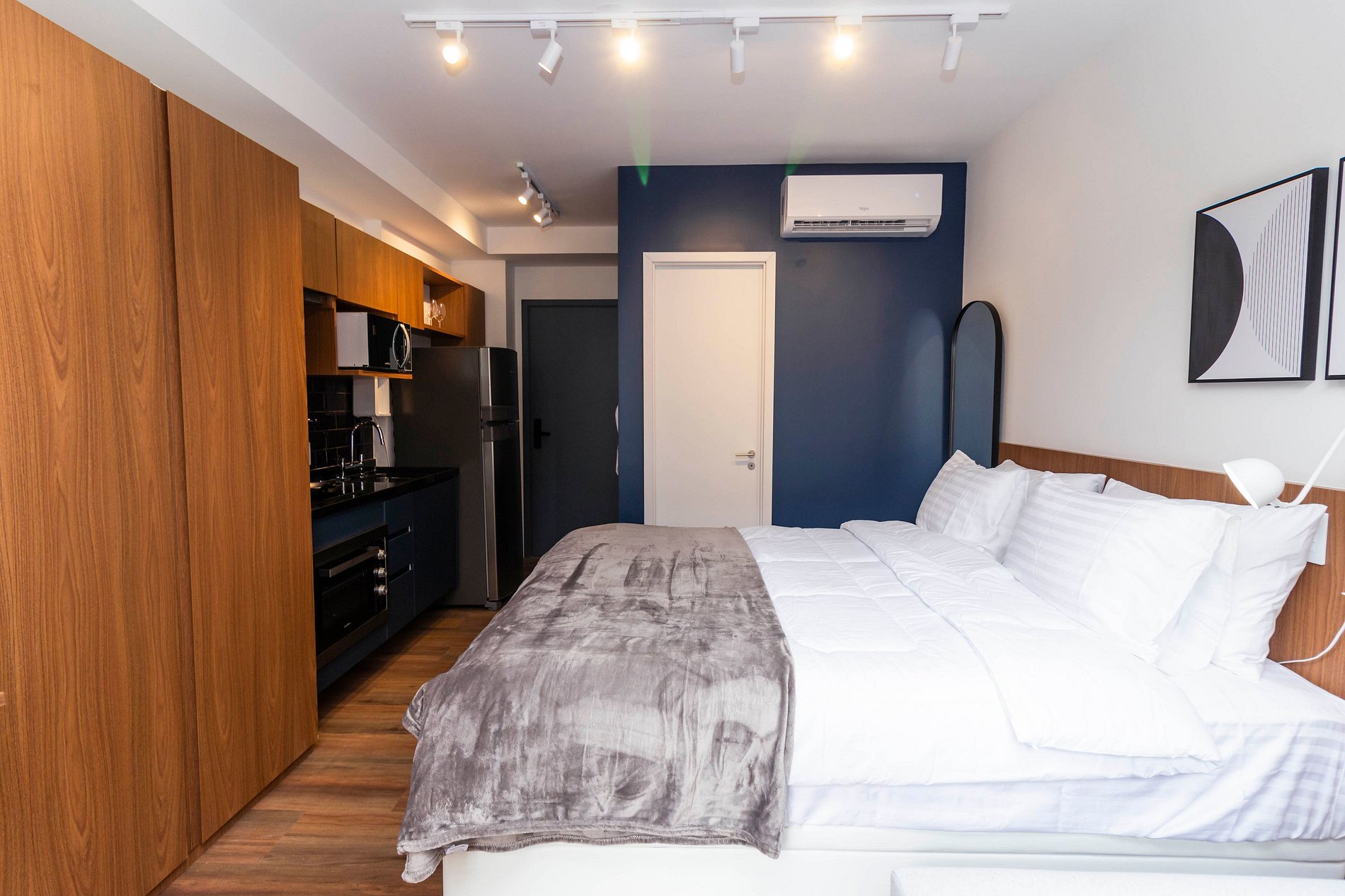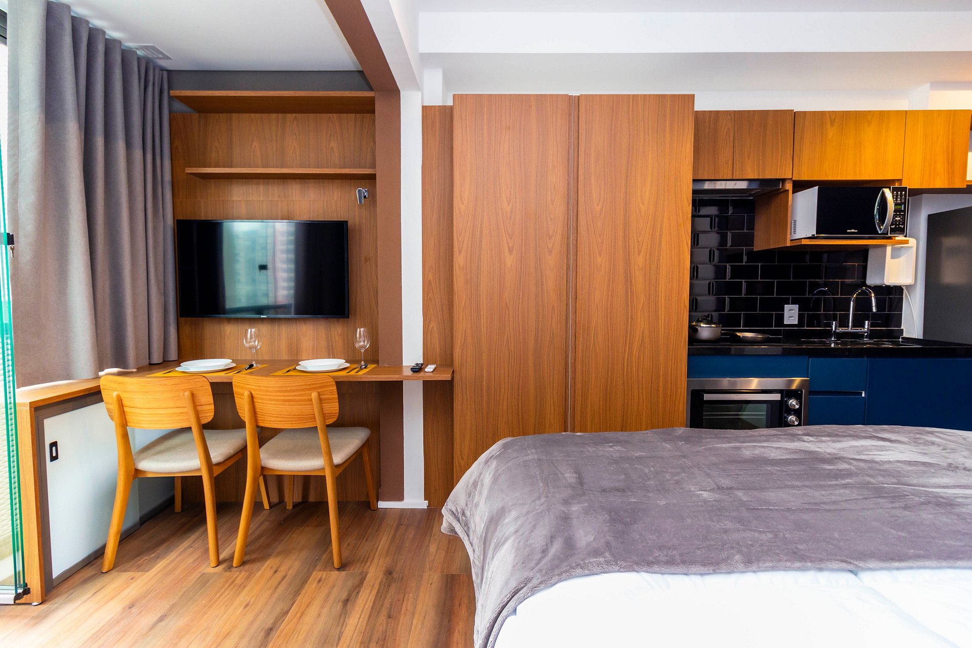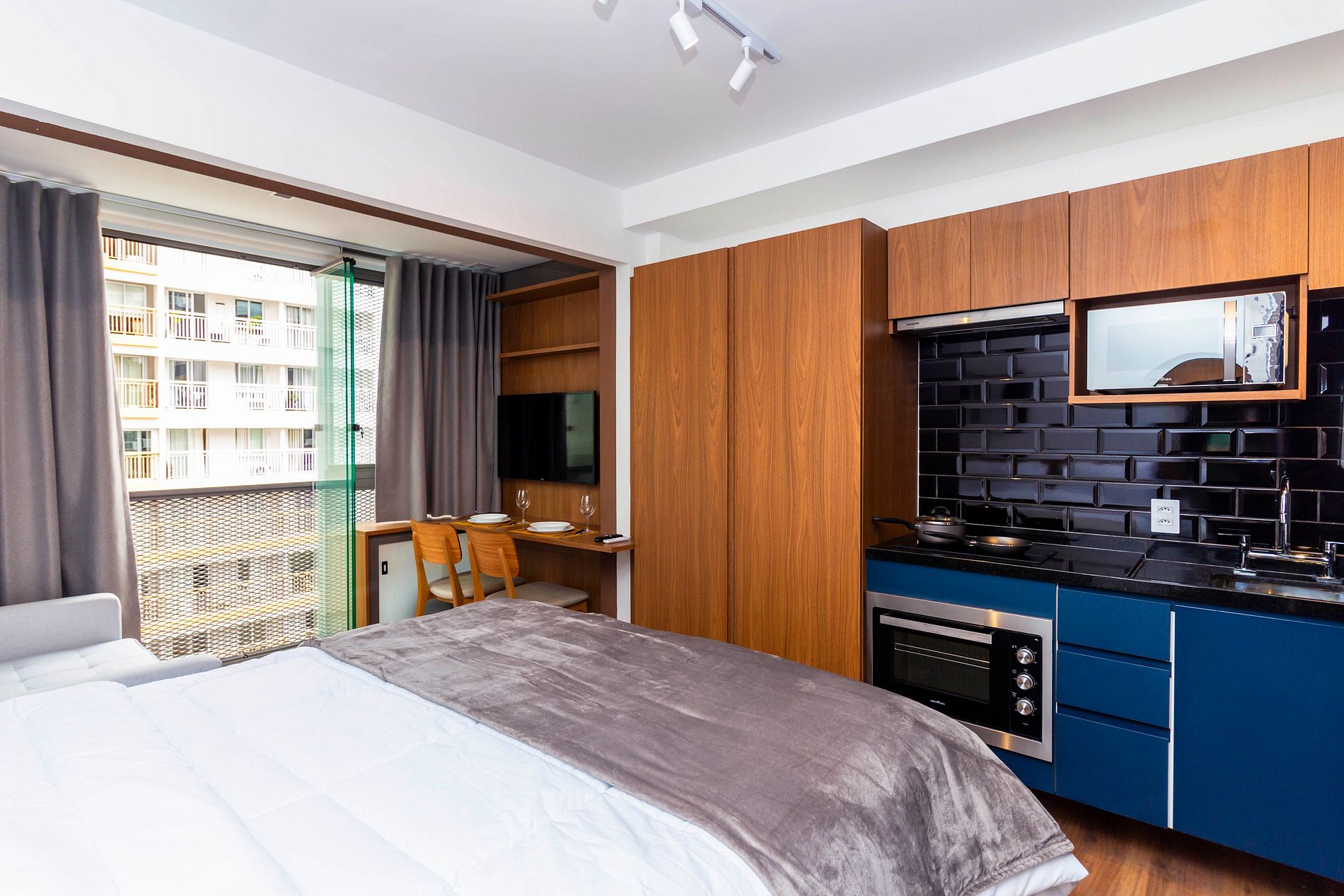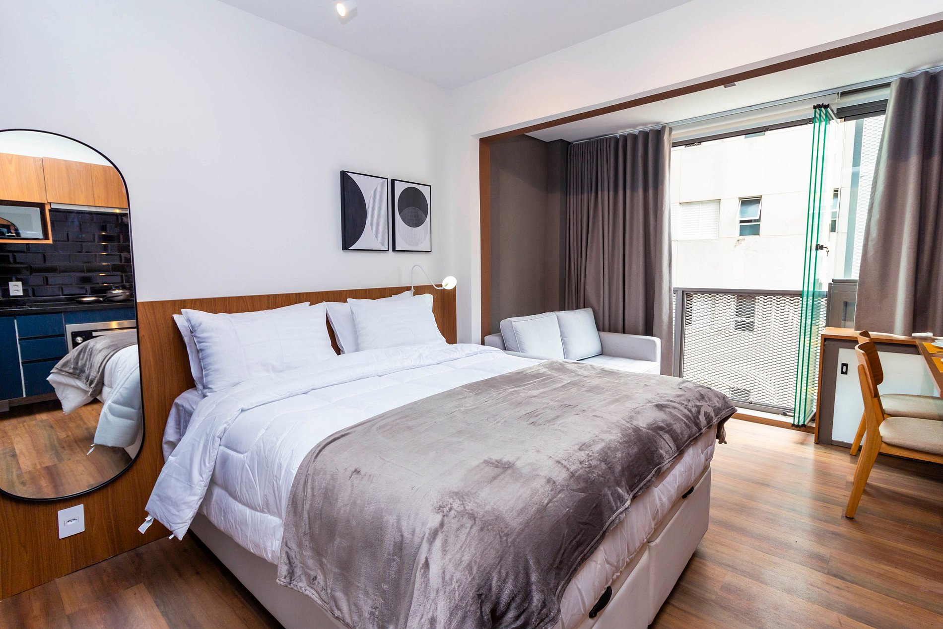 Novíssimo studio de 24m² com decoração moderna, foi preparado para hospedar confortavelmente até 2 pessoas. Super equipado para atender nossos hóspedes que não abrem mão de conforto e sofisticação em suas estadias, repleto de comodidades atendendo hospedagens de curta ou longa temporada.