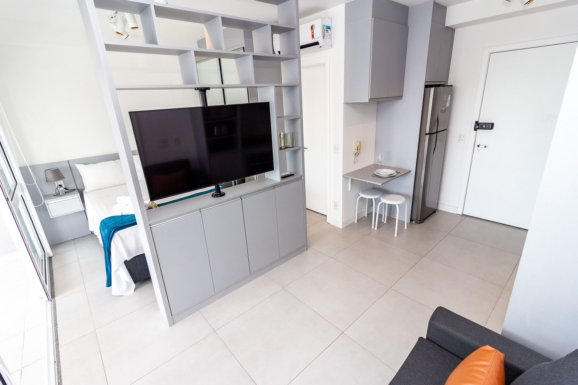 Este studio está repleto de comodidades atendendo hospedagens de curta ou longa temporada.