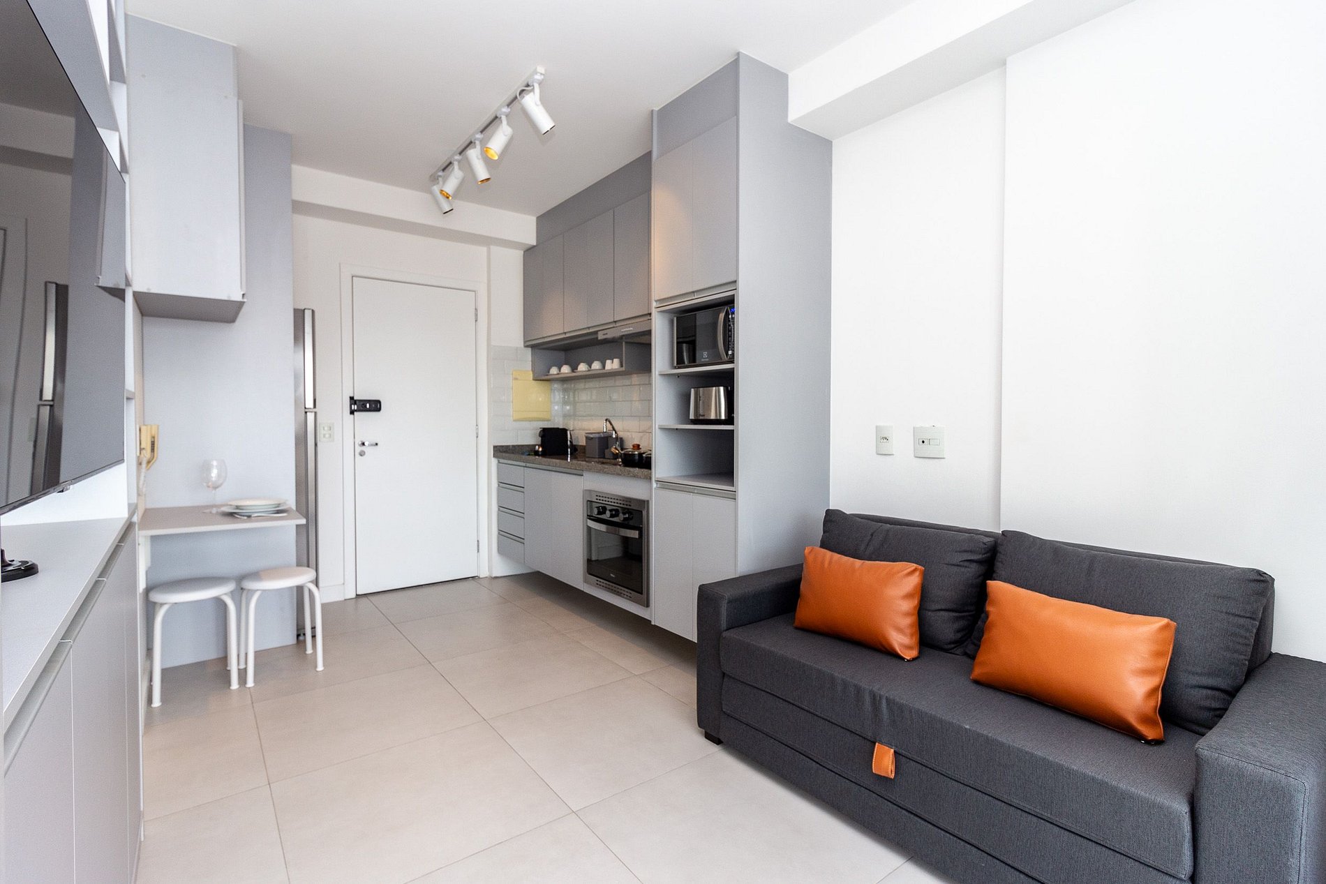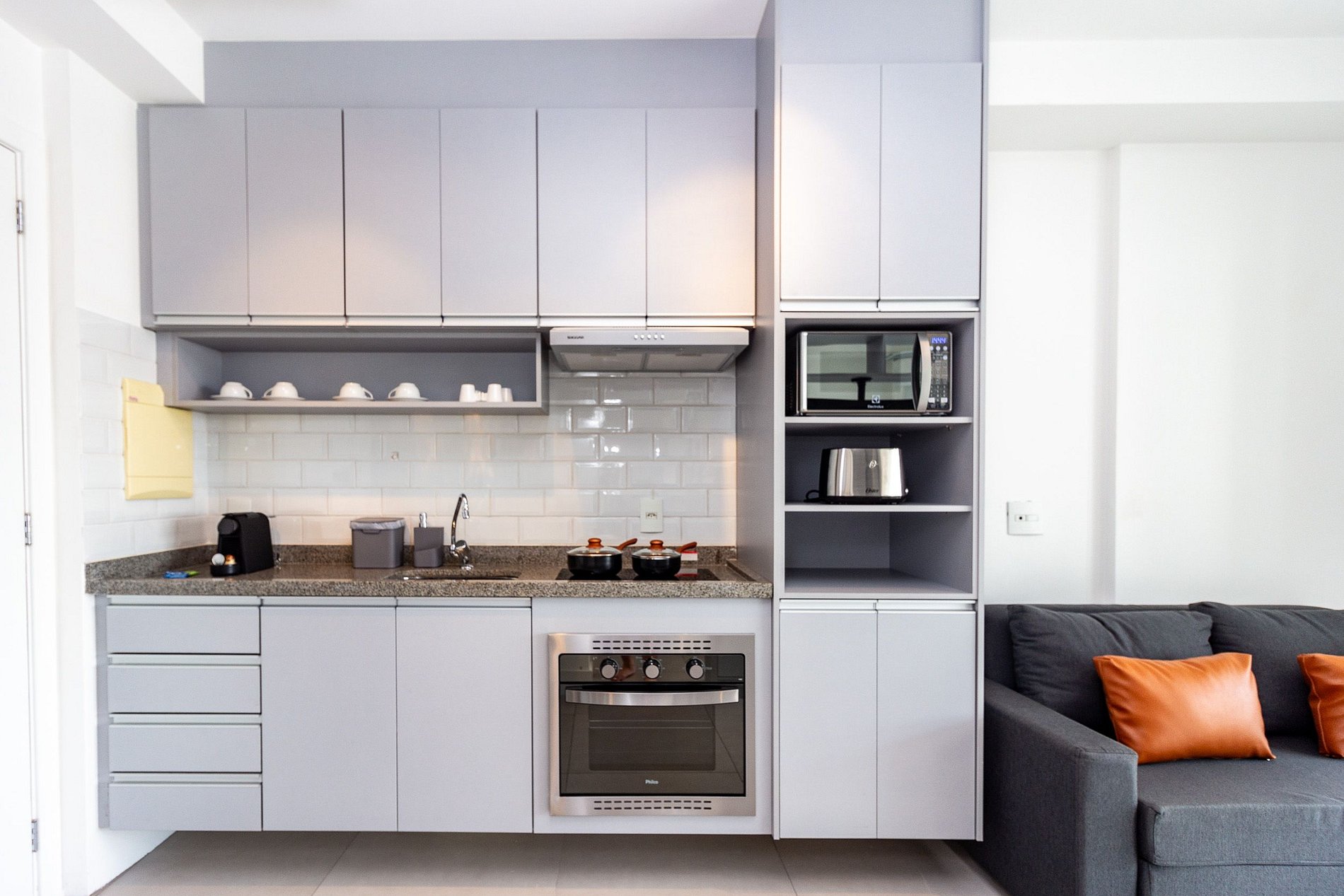 Este studio está repleto de comodidades atendendo hospedagens de curta ou longa temporada.